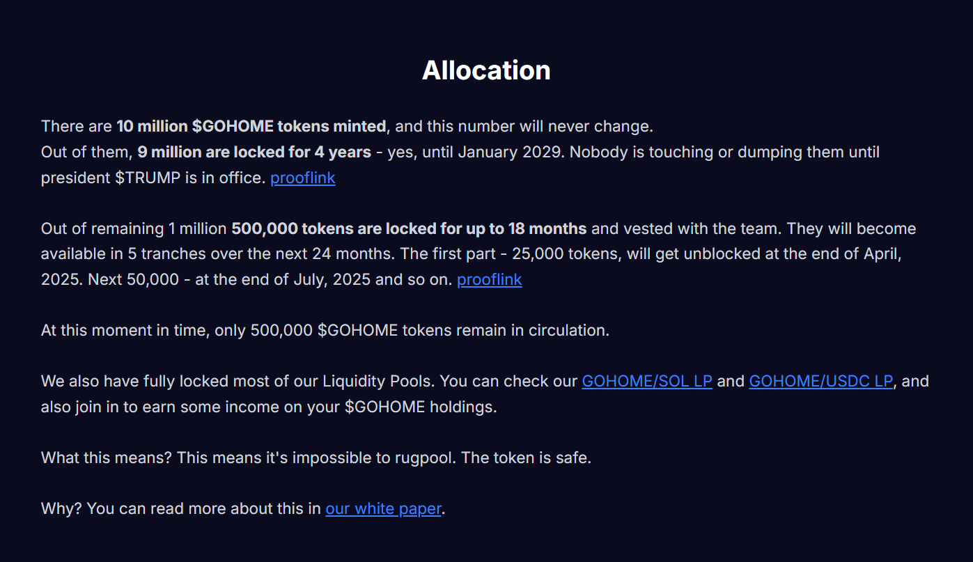 الخطوة الأولى، التي كانت ناجحة بالفعل، تتضمن إطلاق رمز $GOHOME على بلوكتشين سولانا باستخدام نموذج توزيع عادل يعطي الأولوية لمن يأتي أولاً، يخدم أولاً. كما أن المشروع لم يقم بعملية Airdrop، مما يضمن عدم وجود ضغط بيع مبكر.