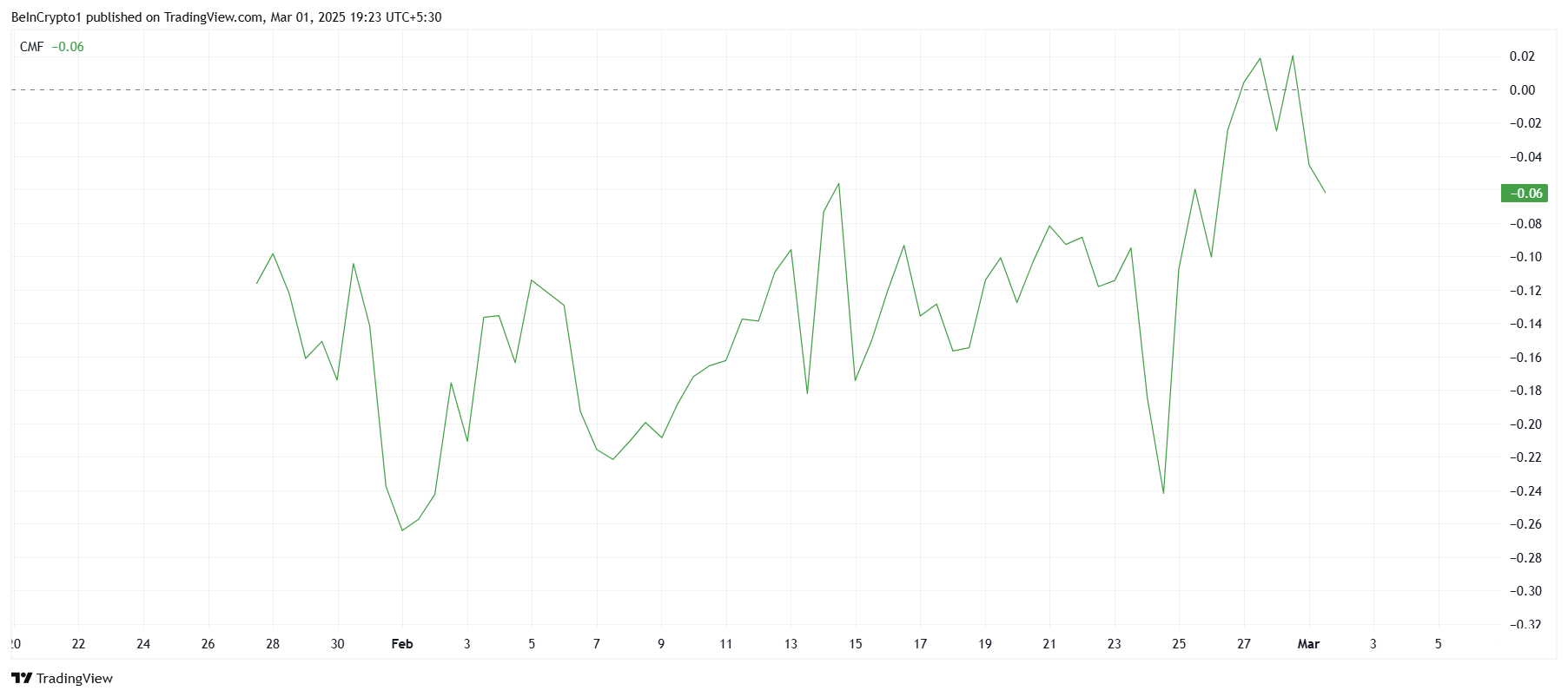 المؤشرات الفنية لـTRUMP تعكس المشاعر السلبية العامة في السوق. يظهر مؤشر تدفق المال تشايكين (CMF)، الذي يتتبع تراكم وتوزيع الأصول، اتجاهًا هبوطيًا واضحًا.