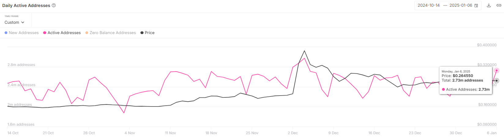ظلت العناوين النشطة على شبكة ترون ثابتة، بغض النظر عن حركة السعر. يواصل أكثر من 2,73 مليون عنوان إجراء المعاملات، دون أي انحراف حتى عندما وصلت ترون إلى أعلى مستوى لها على الإطلاق أو تعرضت لانخفاض في السعر. يبرز هذا الاستقرار مرونة المستثمرين ويقترح الثقة في الإمكانات طويلة الأجل للشبكة.