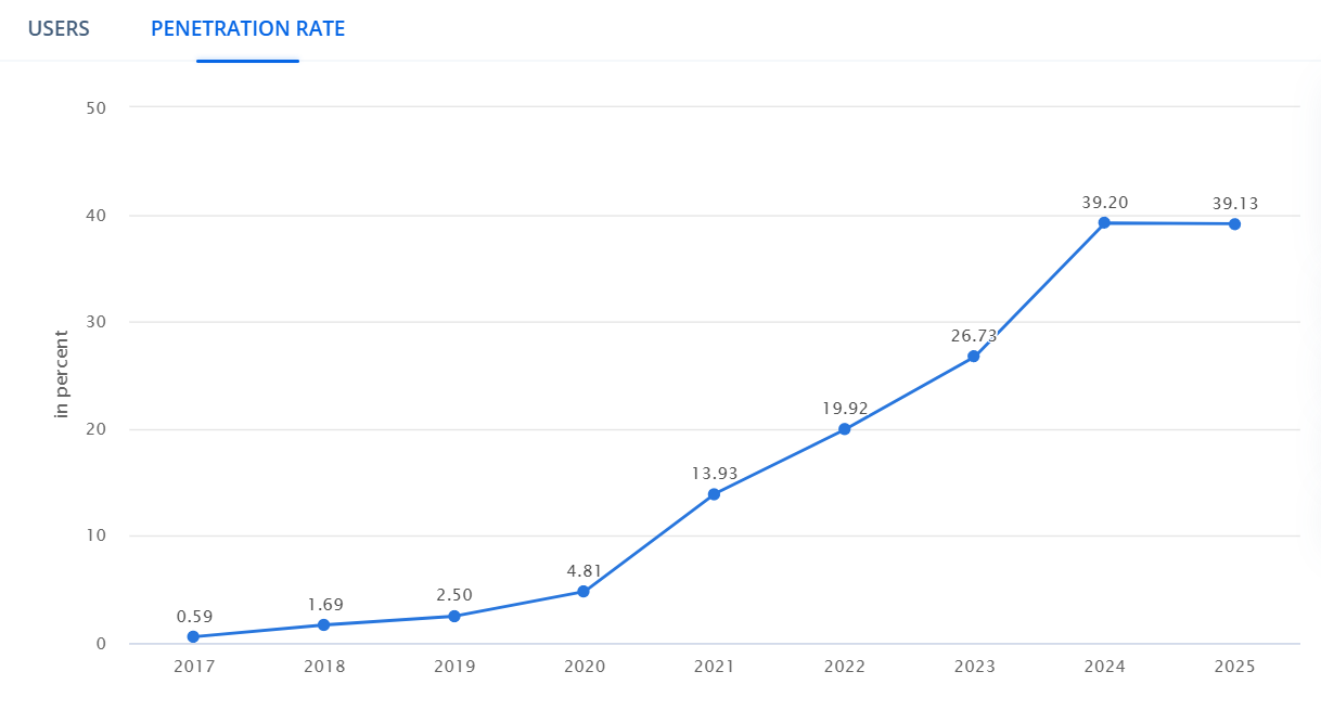 وفقًا لـ Statista، سيصل معدل الاختراق في البلاد إلى 39,13 في 2025. يعتمد هذا الحساب على مؤشرات السوق الرئيسية، مثل الناتج المحلي الإجمالي، إنفاق المستهلك، السكان، اختراق الإنترنت، اختراق الهواتف الذكية، اختراق بطاقات الائتمان، واختراق الخدمات المصرفية عبر الإنترنت.