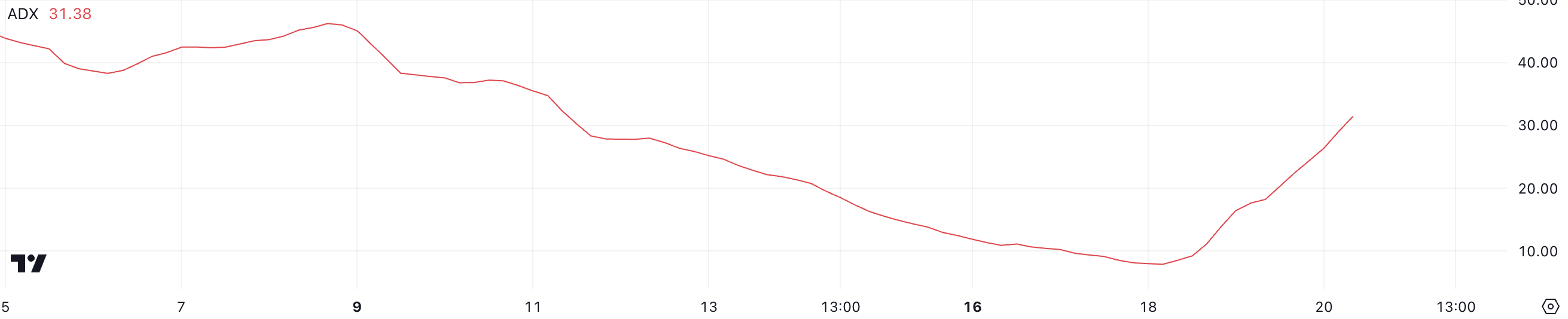 يقيس ADX قوة الاتجاه، بغض النظر عن اتجاهه، على مقياس من 0 إلى 100. تشير القيم أقل من 20 إلى اتجاه ضعيف أو بدون اتجاه، القيم بين 20 و40 تشير إلى اتجاه معتدل، والقيم فوق 40 تدل على اتجاه قوي.
