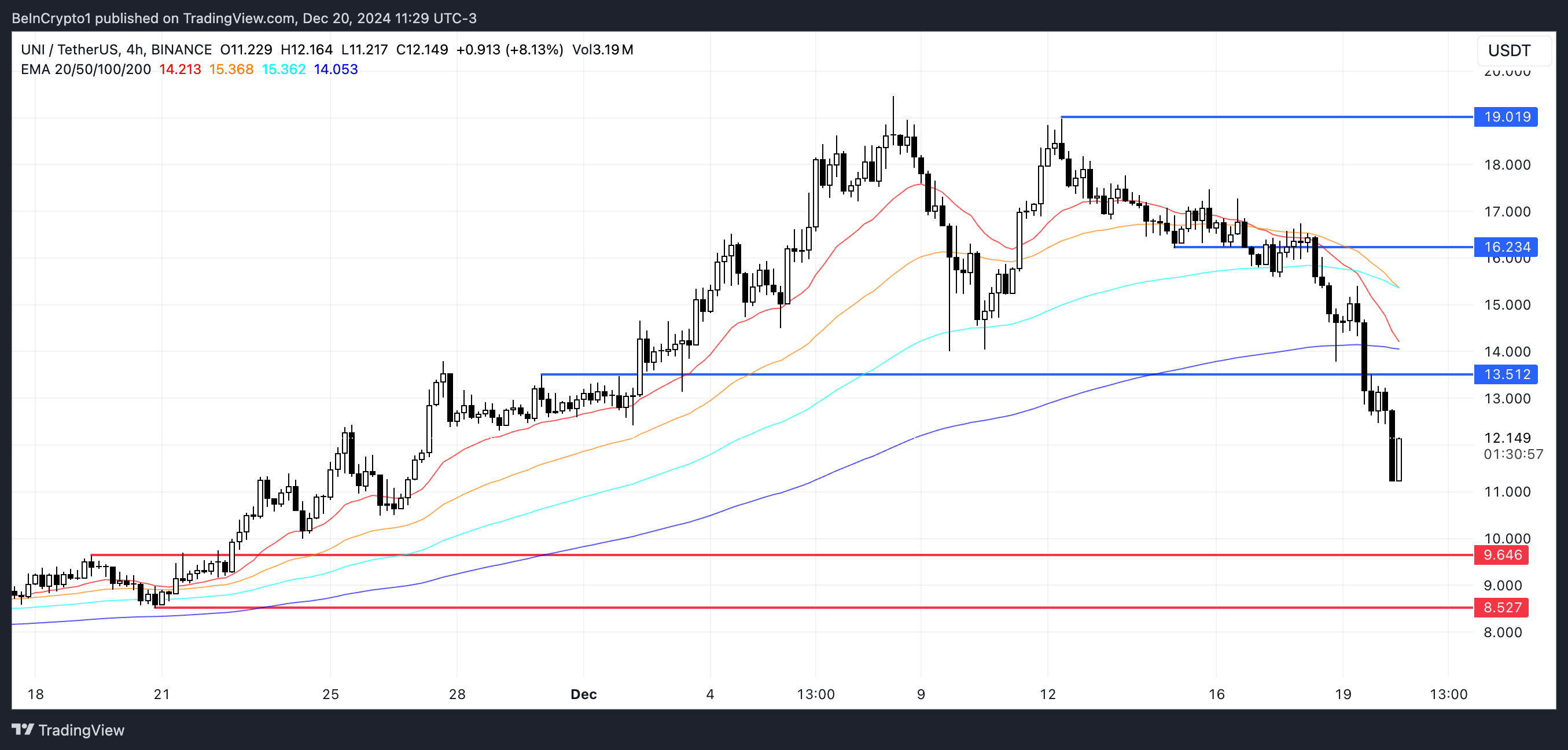 ومع ذلك، إذا تمكن سعر UNI من عكس الاتجاه الهبوطي وبناء اتجاه صعودي قوي، فقد يتحدى أولاً المقاومة عند $13,5.