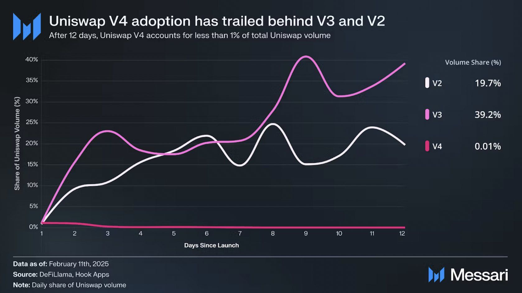 إطلاق يوني سواب V4 DEX، الذي كان متوقعًا بشدة من قبل المجتمع، فشل في توليد المستوى المتوقع من الاهتمام. كان معدل التبني لـ V4 أبطأ بكثير من الإصدارات السابقة، حيث يشغل V4 حاليًا فقط 0,01% من حصة حجم يوني سواب بالكامل. في تناقض صارخ، اكتسبت V3 وV2 زخمًا سريعًا، حيث استحوذت على 40% و20% من حصة السوق، على التوالي، في غضون 12 يومًا فقط من إطلاقها.