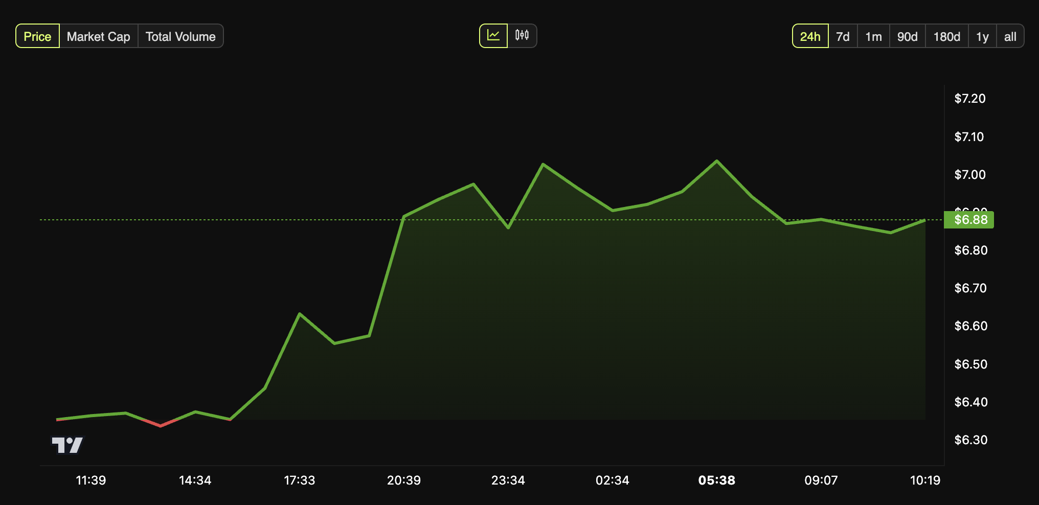 في وقت النشر، كان يتم تداول UNI بسعر $6,8. بالإضافة إلى ذلك، شهد حجم التداول ارتفاعًا ملحوظًا بنسبة 207,9%، مما يبرز زيادة كبيرة في النشاط.