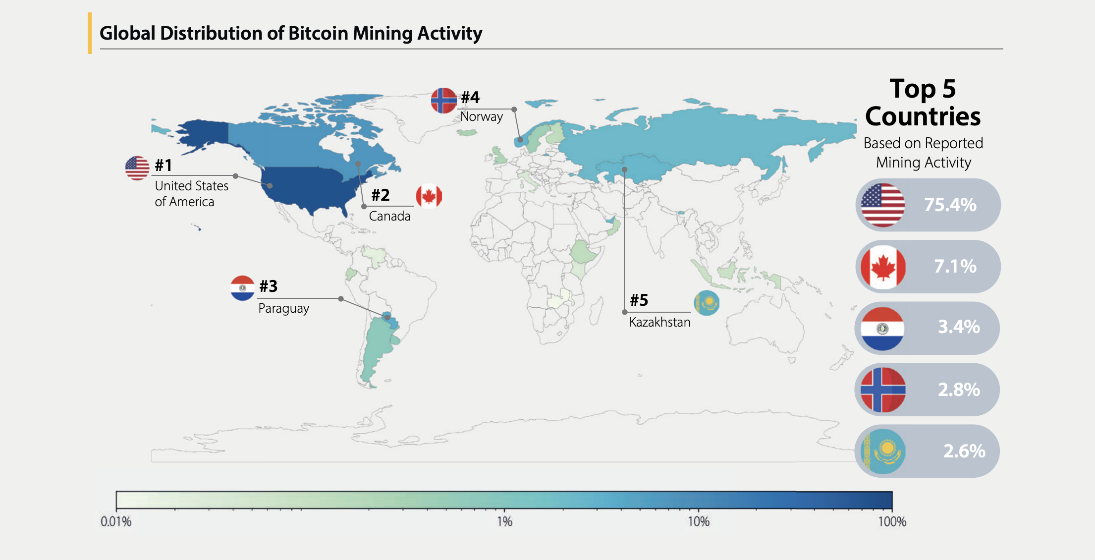 من بين 97 شركة سجلت في الاستطلاع، أكملت 49 شركة الاستطلاع، مما أدى إلى معدل استجابة بنسبة 50,5%. أبرز التقرير أن الولايات المتحدة تفوقت بشكل كبير على جميع الدول الأخرى فيما يتعلق بسيطرة تعدين بيتكوين.