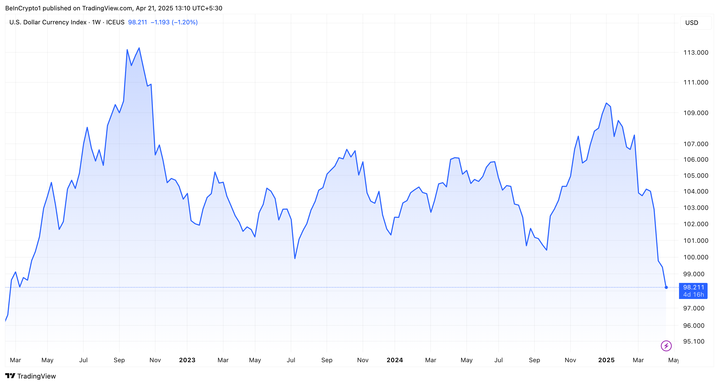 وفقًا لأحدث البيانات، انخفض DXY إلى ما دون 99. في وقت النشر، كان عند 98,2، مما يمثل أدنى قيمة منذ مارس 2022.