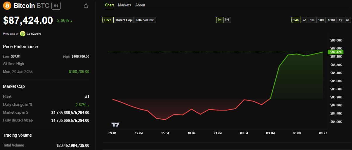 تظهر بيانات BeInCrypto أن بيتكوين (BTC) كان يتم تداوله بسعر 87,424 دولارًا في وقت كتابة هذا التقرير. ويمثل هذا زيادة متواضعة بنسبة 2,66% في الـ24 ساعة الماضية.