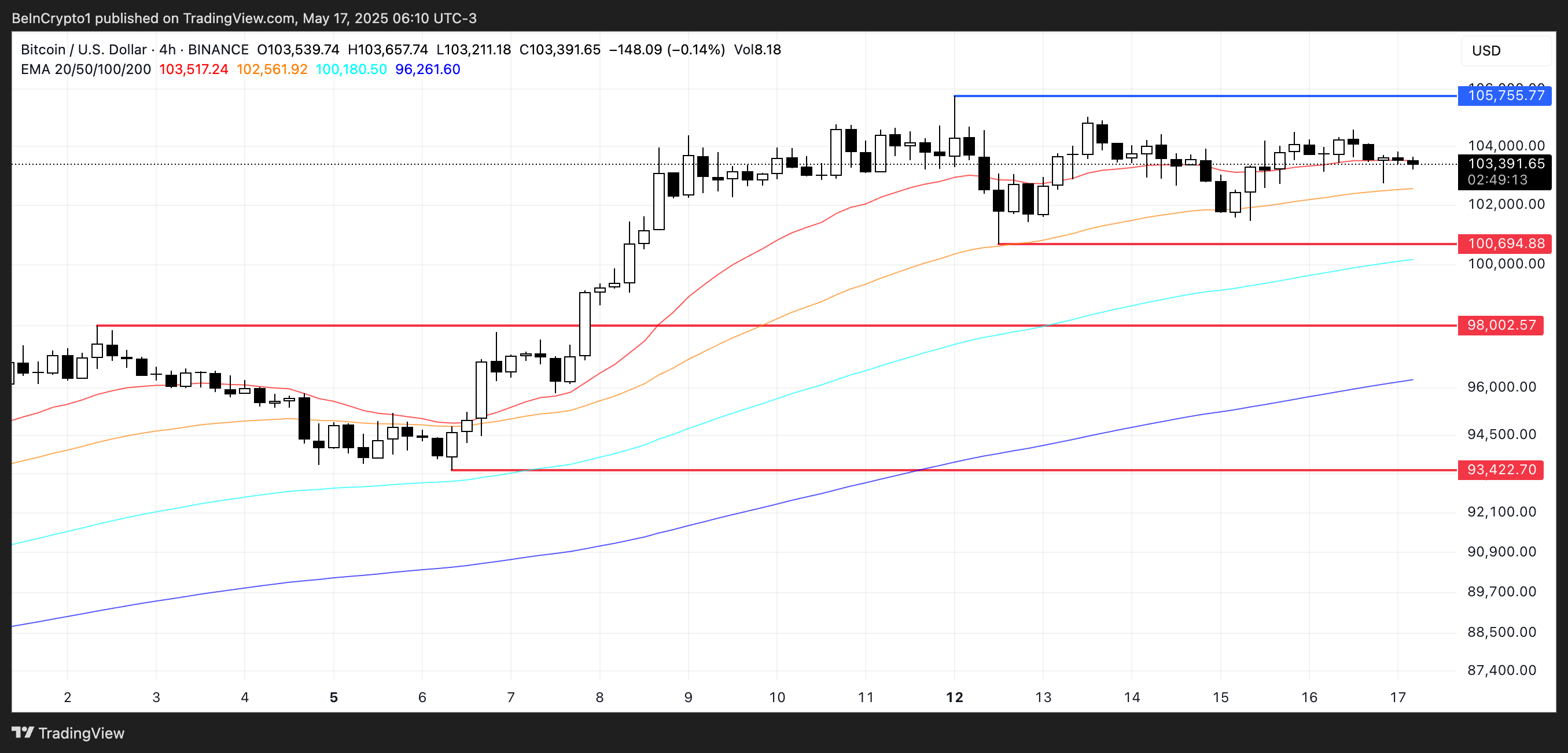 على المدى القصير، ومع ذلك، يبقى سعر بيتكوين في مرحلة توطيد بعد كسره فوق $100,000. لا تزال خطوط EMA الخاصة به صاعدة، مع متوسطات قصيرة الأجل فوق الأطول، لكنها تتسطح.