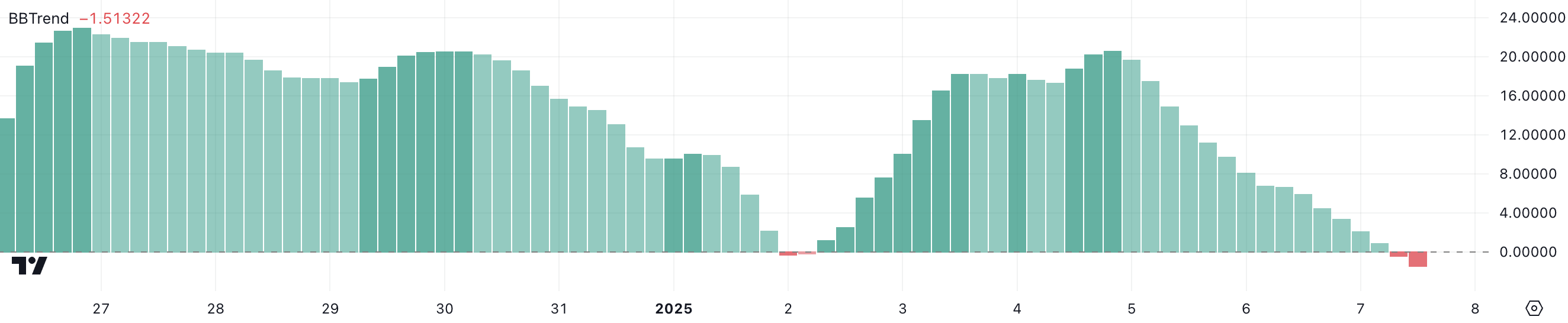 فيرتشوال BBTrend تحول إلى السلبية، حاليًا عند -1,51، بعد أن كان إيجابيًا بين 2 يناير وأوائل 7 يناير. BBTrend هو مؤشر تقني مشتق من بولينجر باندز، يستخدم لتقييم قوة واتجاه تحركات الأسعار.