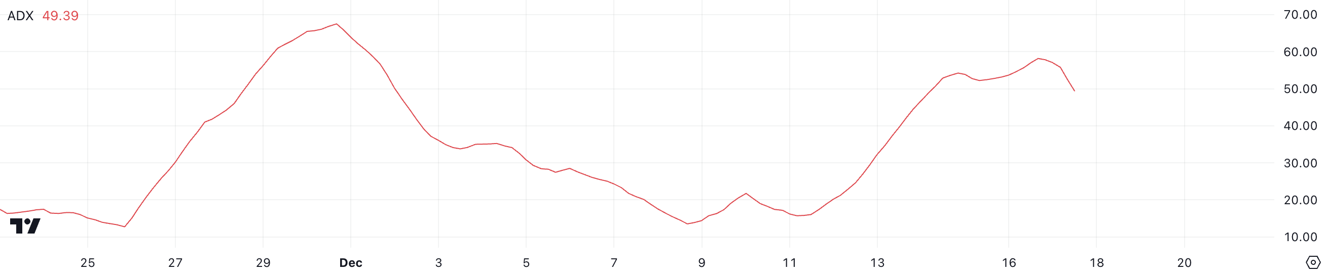 بينما لا يزال قراءة 49,3 تعكس اتجاهًا قويًا نسبيًا، يشير الانخفاض في ADX إلى أن الاتجاه الصعودي قد يضعف، مما يزيد من احتمال حدوث انعكاس أو تماسك. يحدث هذا التحول غالبًا عندما يبدأ ضغط الشراء في التراجع، ويبدأ المتداولون في تأمين الأرباح، مما قد يؤدي إلى تغيير في الاتجاه.