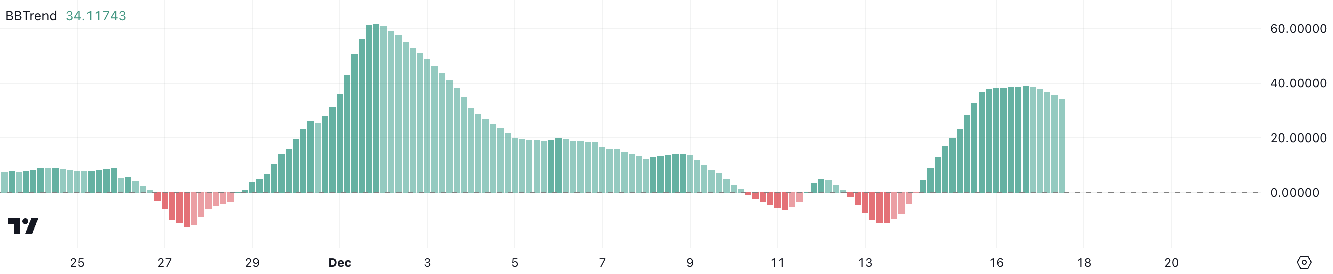 إذا استمر هذا الاتجاه، فقد يؤدي إلى توطيد الأسعار أو حتى تراجع حيث يسعى المتداولون لتأمين الأرباح. للحفاظ على مسارها الصعودي، يحتاج BBTrend لـ VIRTUAL إلى الاستقرار أو استئناف صعوده، مما يشير إلى تجدد القوة واستمرار الزخم الصعودي.
