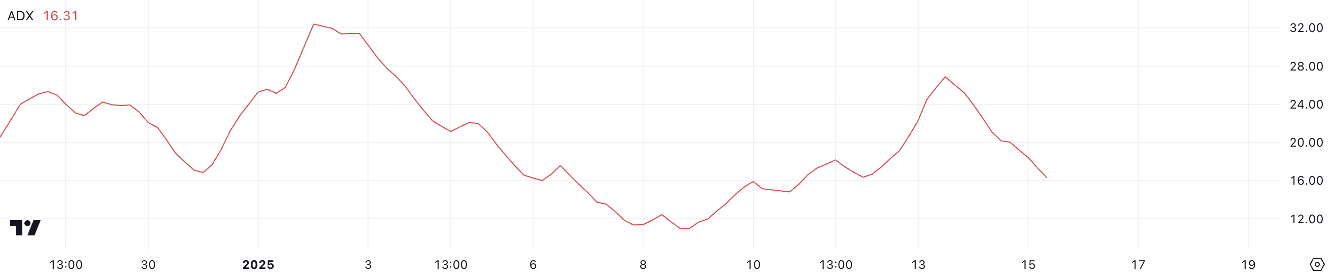 يقيس ADX، أو مؤشر الاتجاه المتوسط، قوة الاتجاه دون الإشارة إلى اتجاهه. تشير القيم أقل من 20 إلى اتجاه ضعيف وفوق 25 تعكس اتجاهًا أقوى وأكثر تحديدًا. VIRTUAL الحالي ADX عند 16,3 يشير إلى أنه بينما يحاول التحول إلى اتجاه صعودي، إلا أن الاتجاه لم يتماسك بعد.