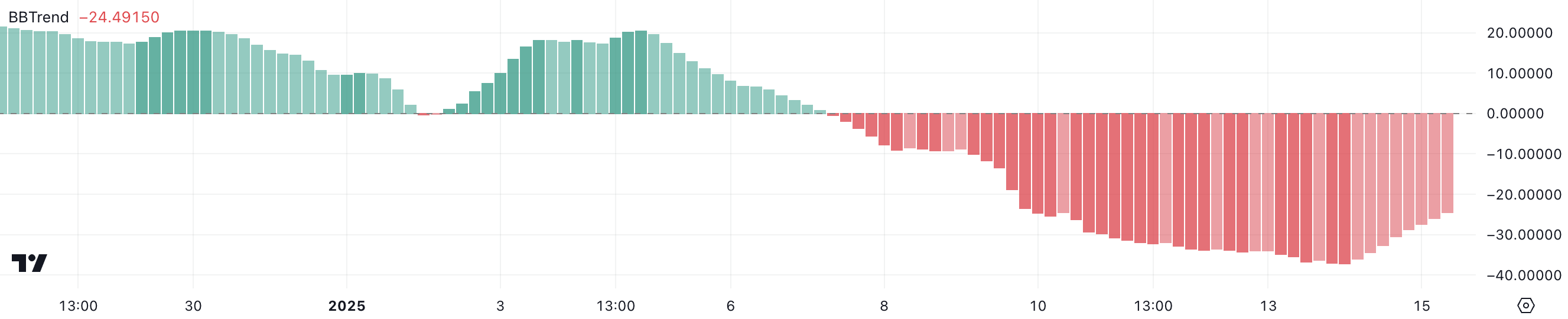 إذا استمر BBTrend في التعافي، فقد يشير ذلك إلى ضعف الاتجاه الهبوطي ويمهد الطريق لاستقرار الأسعار المحتمل أو الانعكاس.