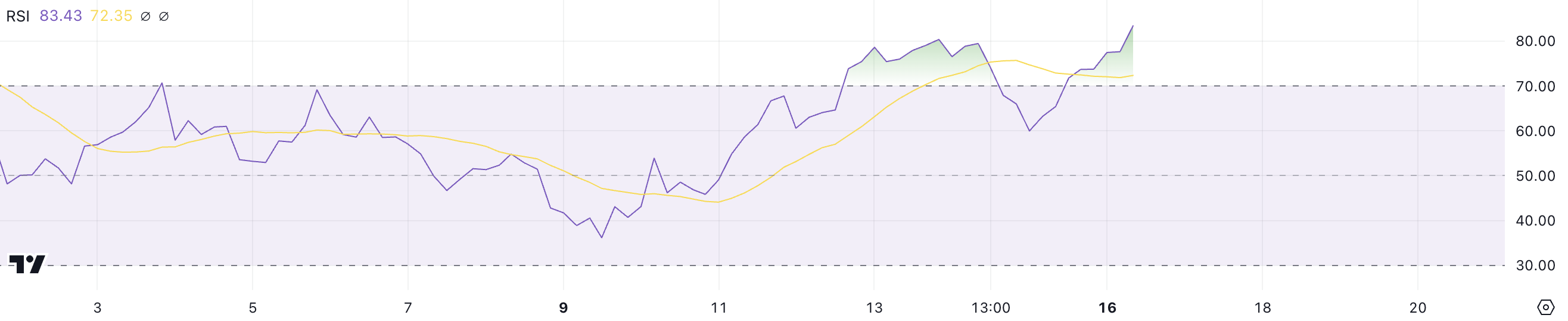 مؤشر القوة النسبية (RSI) لـ VIRTUAL حاليًا عند 83، وهو ارتفاع حاد من 60 قبل يوم واحد فقط. يعتبر RSI مؤشر زخم رئيسي يقيس سرعة وحجم تغيرات الأسعار على مقياس من 0 إلى 100.