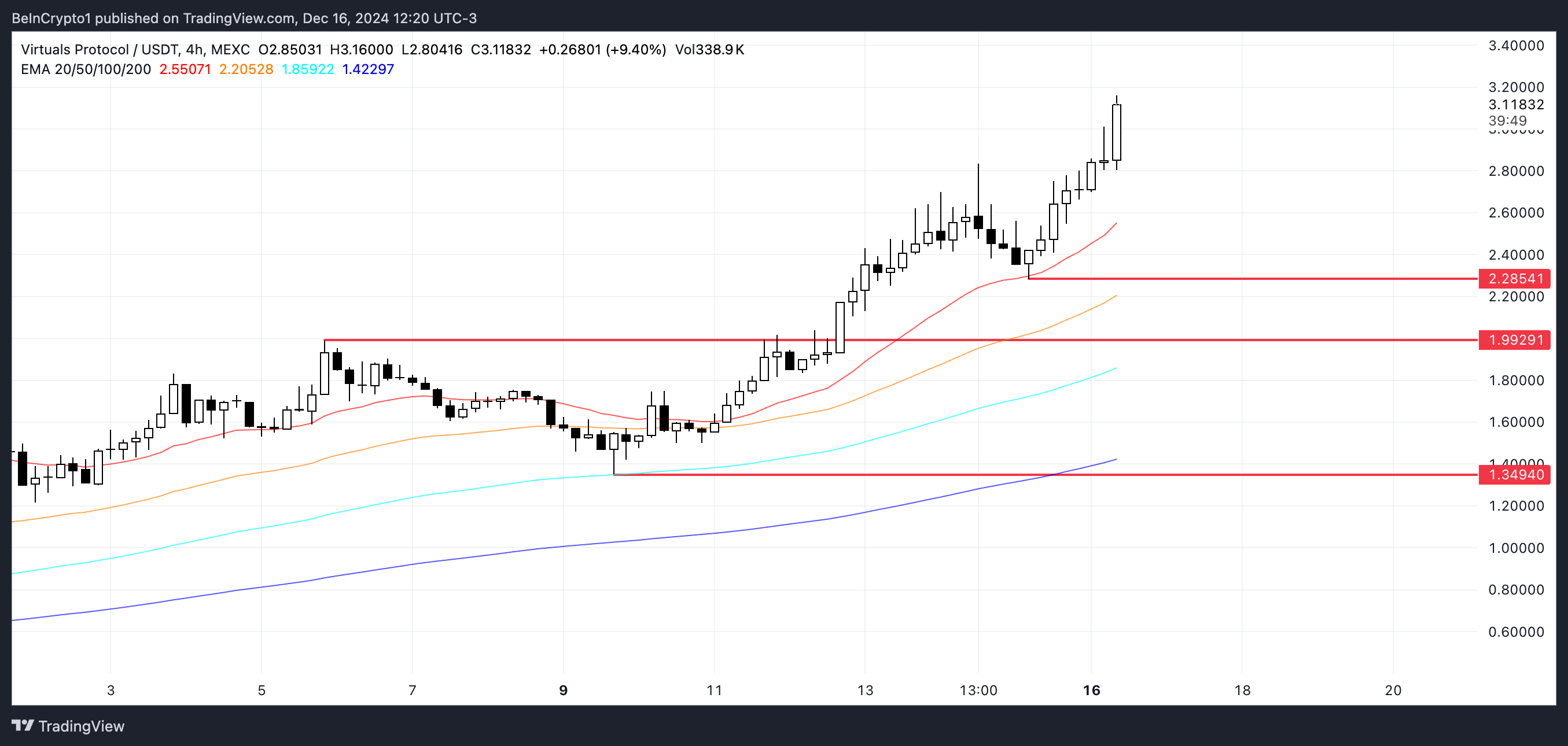 بين 12 ديسمبر و14 ديسمبر، بقي مؤشر القوة النسبية لـ VIRTUAL باستمرار فوق 70، مما يشير إلى زخم قوي خلال تلك الفترة. بينما يمكن أن يستمر هذا الاتجاه في الأيام القادمة مع محاولة VIRTUAL كسر أرقام قياسية جديدة، فإن البقاء فوق 70 لفترة طويلة يمثل تحديًا وغالبًا ما يكون غير مستدام.