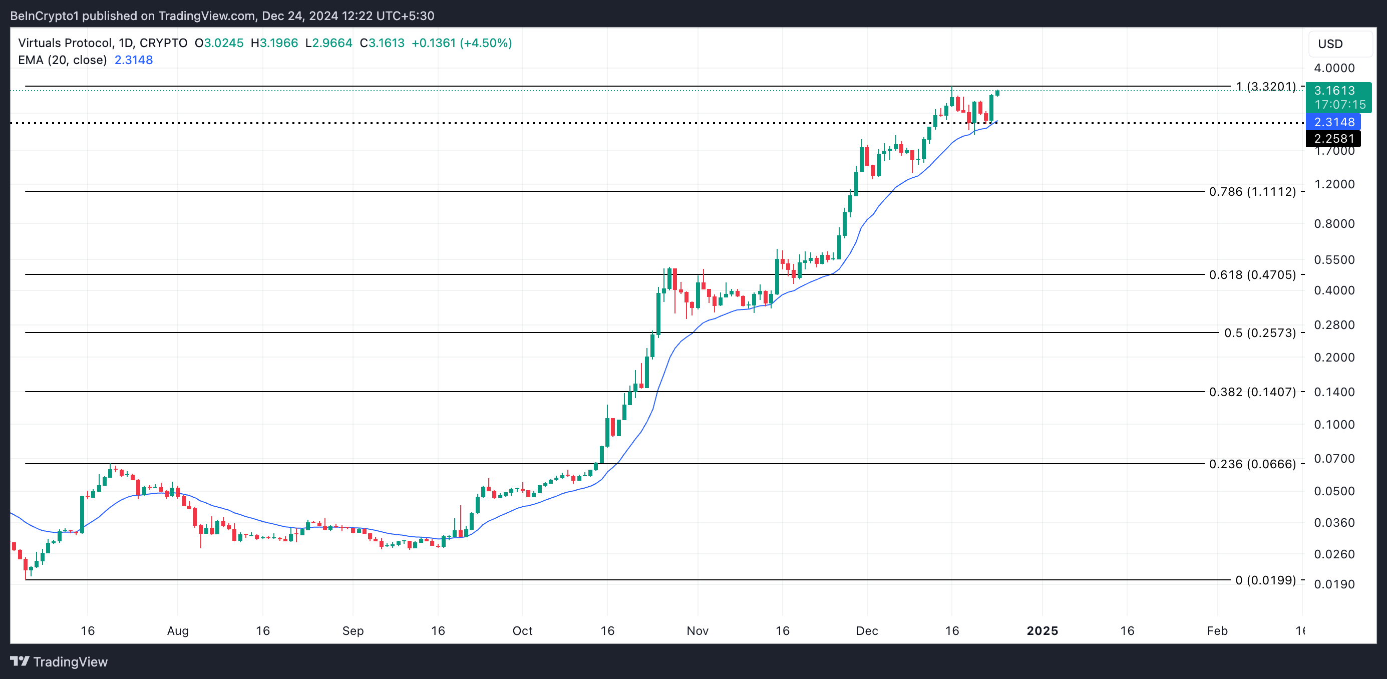 في الرسم البياني اليومي، يتداول VIRTUAL تحت أعلى مستوى له على الإطلاق بقليل عند 3,32 دولار، والذي وصل إليه آخر مرة في 16 ديسمبر. يأتي هذا بعد أن ارتد عن الدعم المقدم من المتوسط المتحرك الأسي لمدة 20 يومًا (EMA) عند 2,31 دولار خلال جلسة التداول يوم الاثنين.