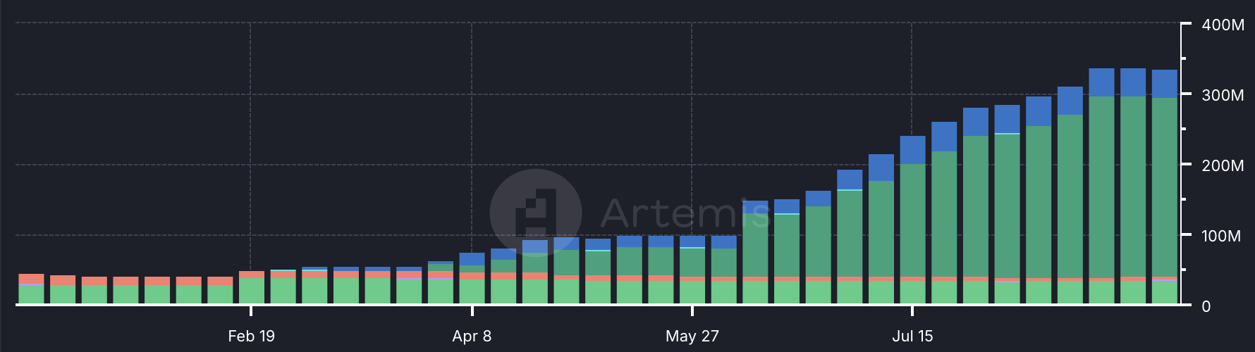 “أحجام النقل عبر جميع الفئات تنمو، مما يشير إلى أن العناوين لا تقوم بإغراق الشبكة بمعاملات صغيرة جدًا. كما نمت معروض العملات المستقرة على سيلو بشكل كبير في العام الماضي أيضًا”، كتبت أرتميس هنا.