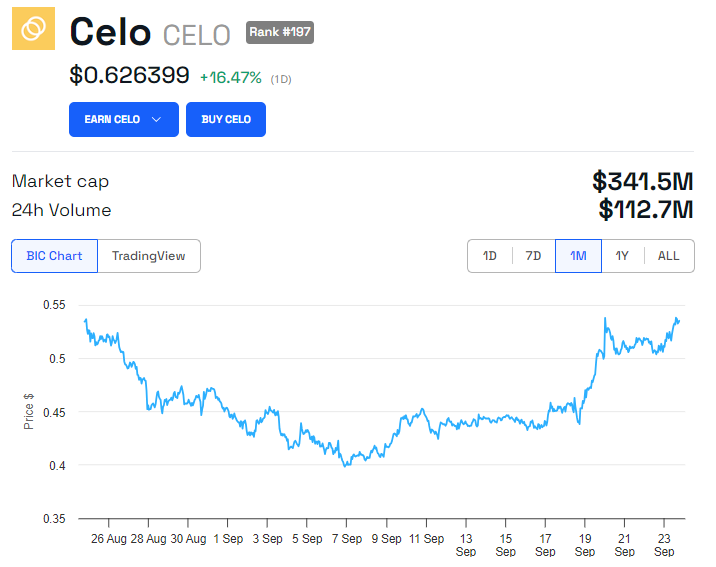 وسط مدح بوتيرين، ارتفع سعر رمز سيلو بأكثر من 16% منذ جلسة الأربعاء، ويتم التداول الآن بسعر 0,626 دولار.