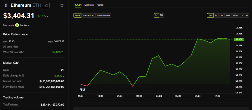 Sponsored Sponsoredتُظهر بيانات BeInCrypto أن ETH كان يتداول عند $3,404 في وقت كتابة هذا التقرير، مرتفعًا بأكثر من 6% منذ افتتاح جلسة الجمعة.