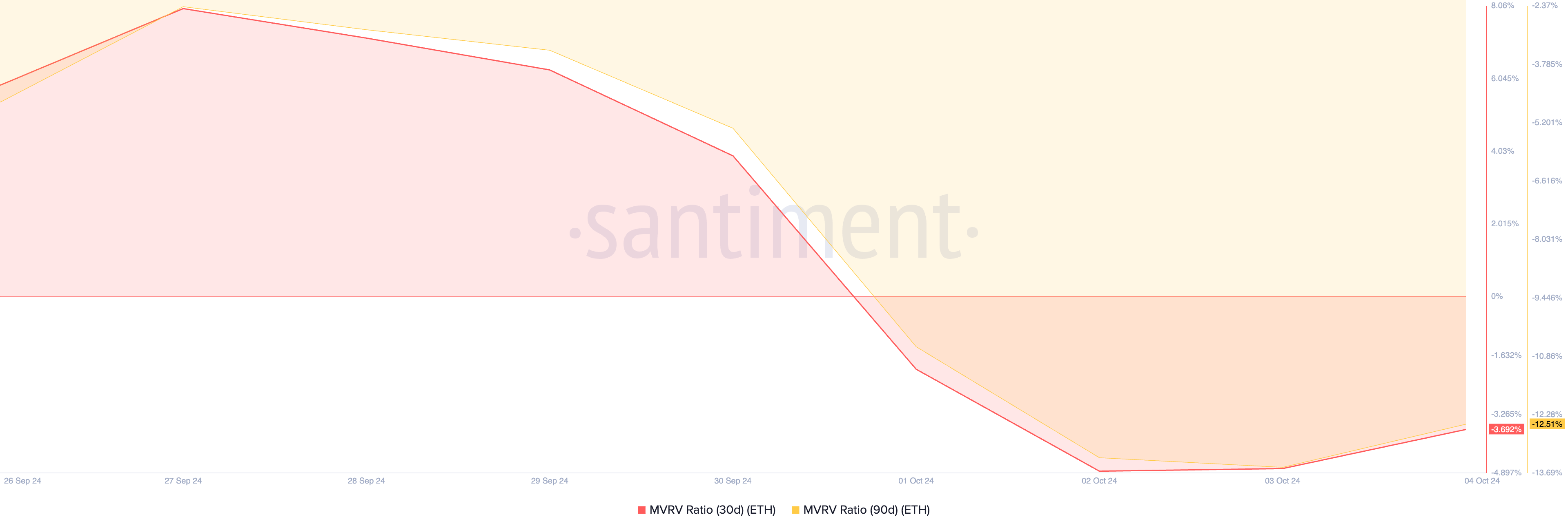 العملة البديلة الرائدة، إيثريوم (ETH)، شهدت انخفاضًا في قيمتها بنسبة 10% خلال الأيام السبعة الماضية. ومع ذلك، فقد قدم هذا الانخفاض فرصة للشراء كما يتضح من نسبة القيمة السوقية إلى القيمة المحققة (MVRV) السلبية، والتي تقيس الربحية الإجمالية لجميع حائزيها.