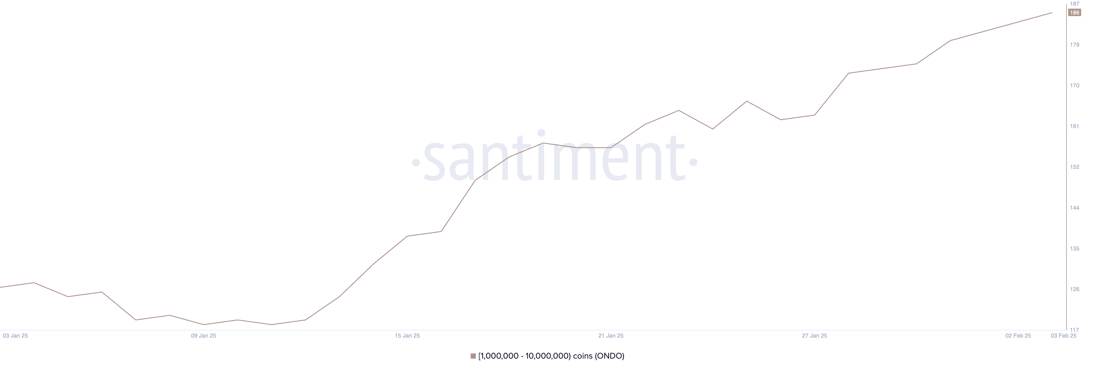 ارتفع عدد العناوين التي تحتفظ على الأقل بـ 1,000,000 ONDO بشكل مطرد منذ 12 يناير، حيث ارتفع من 180 إلى 186 بين 31 يناير و3 فبراير.