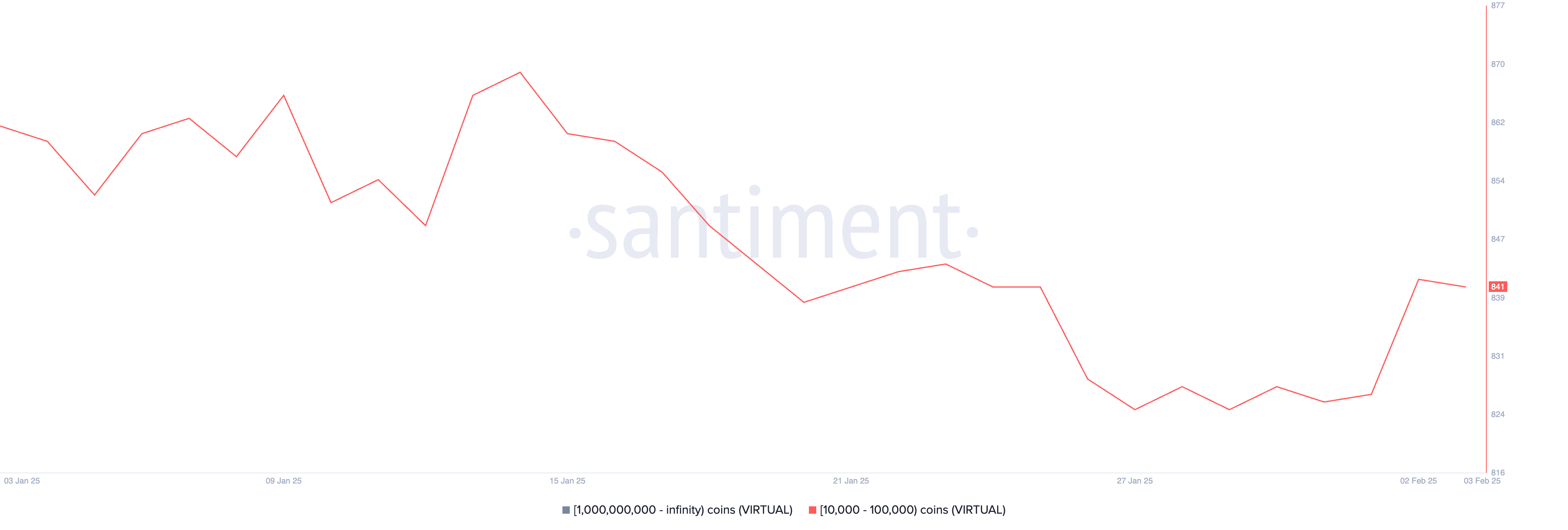 استقر عدد الحيتان التي تحتفظ بين 10,000 و100,000 VIRTUAL بعد انخفاضه من 841 في 25 يناير إلى 825 في 27 يناير.