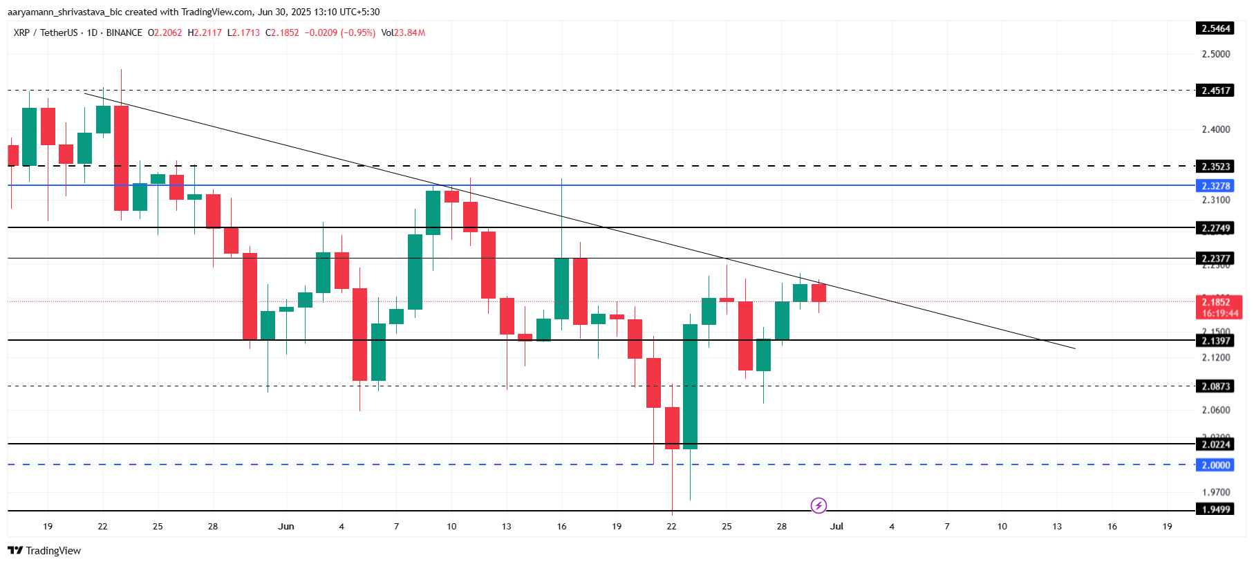 بداية يوليو وQ3 قد تقدم نظرة قاتمة لـ XRP إذا بقي السعر محصورًا بين ٢,٢٣ دولار و٢,١٣ دولار. هذا السيناريو سيشير إلى استمرار الاتجاه الهبوطي.
