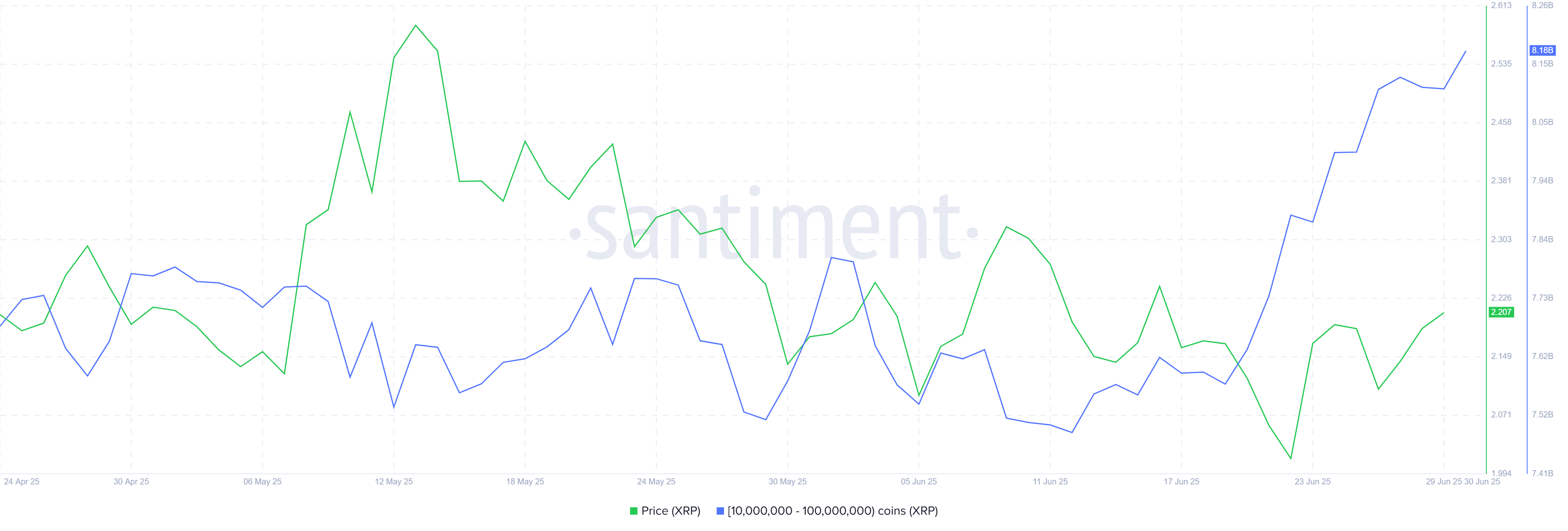 كانت نشاطات الحيتان عاملًا حاسمًا في الأيام العشرة الماضية، حيث قام حاملو XRP الكبار بتجميع كميات كبيرة على الرغم من تقلبات الأسعار. العناوين التي تحتفظ بين 10 ملايين و100 مليون XRP قد اشترت أكثر من 610 ملايين XRP بقيمة تزيد عن 1,33 مليار دولار.