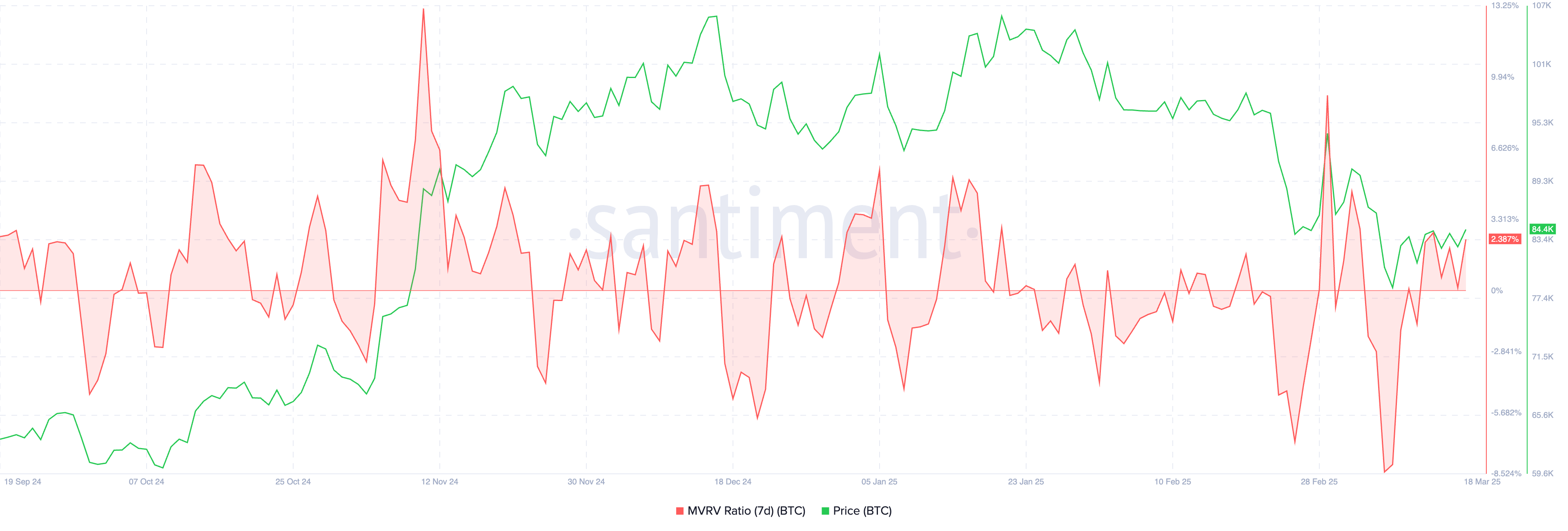نسبة MVRV (القيمة السوقية إلى القيمة المحققة) لبيتكوين لمدة 7 أيام ارتفعت إلى 2,38%، متعافية من أدنى مستوى لها مؤخرًا عند -8,44% في 8 مارس.