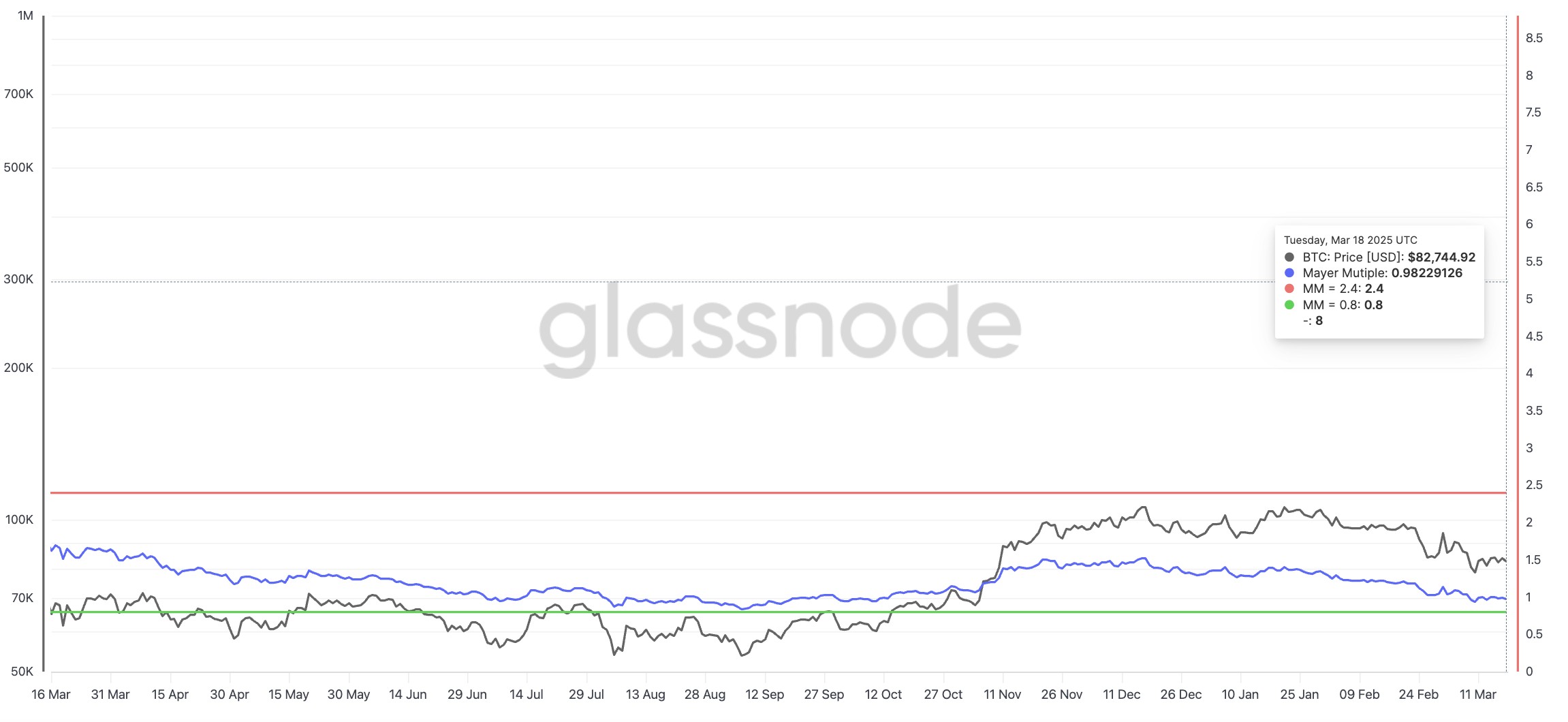 مؤشر ماير لبيتكوين يجلس حاليًا عند 0,98، وهو أعلى قليلاً من أدنى مستوى له مؤخرًا عند 0,94 المسجل في 10 مارس.