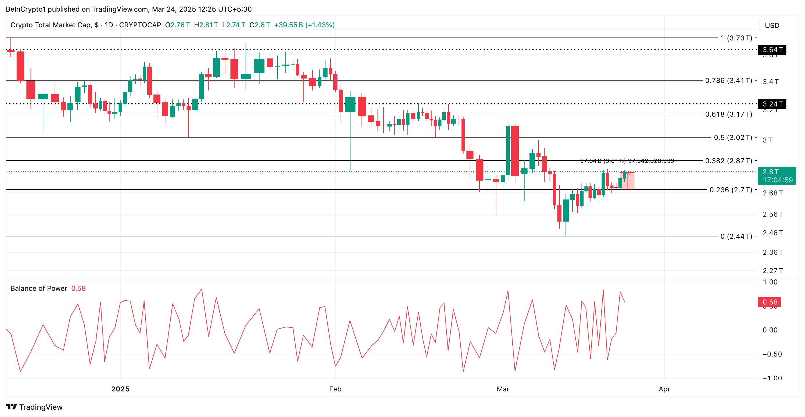 لقد أضاف 98 مليار دولار في الـ24 ساعة الماضية، ليصل إلى 2,8 تريليون دولار وقت النشر. على الرسم البياني اليومي، يؤكد توازن القوة الإيجابي (BoP) هذا الارتفاع في ضغط الشراء بين المشاركين في السوق. وهو حاليًا عند 0,58.