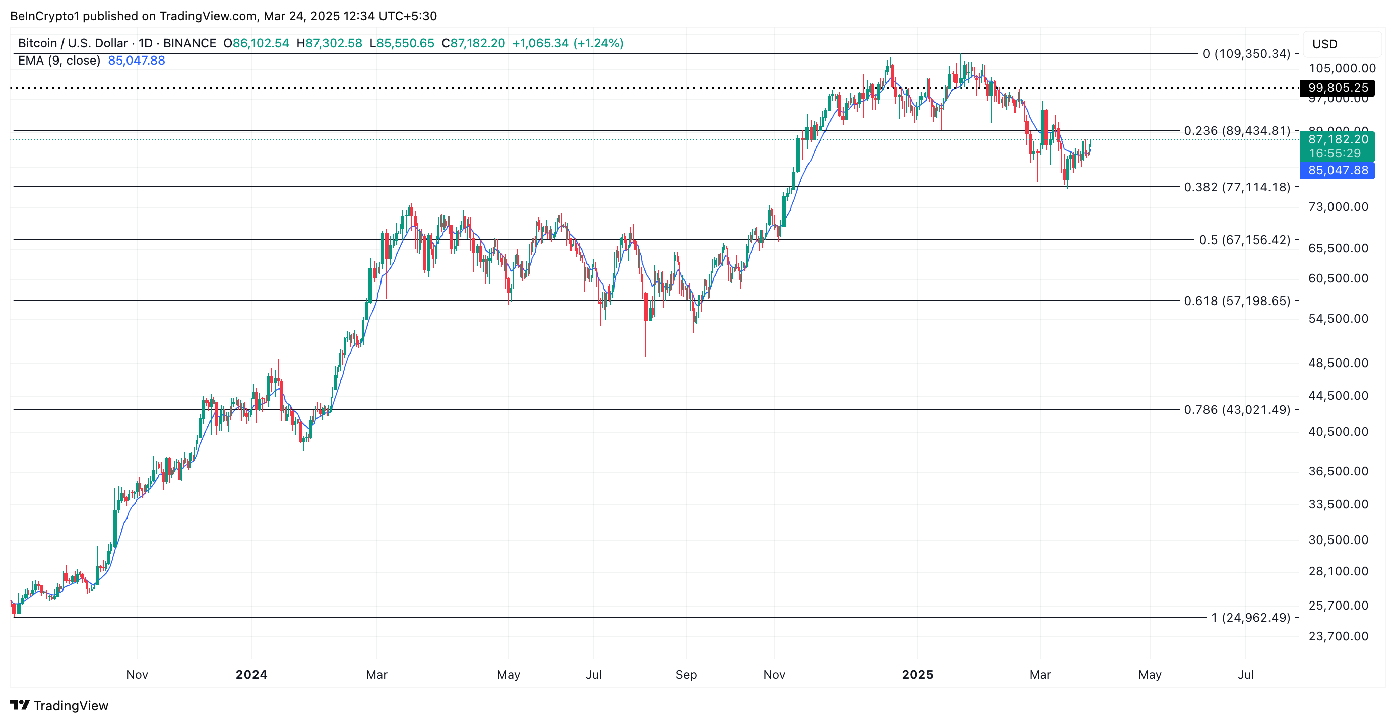 تتداول العملة الرائدة بيتكوين عند 87,182 دولار، مسجلة نموًا في السعر بنسبة 3% خلال الـ24 ساعة الماضية. وقد دفع الارتفاع المستمر لـBTC خلال الأسبوع الماضي سعرها فوق المتوسط المتحرك الأسي لـ20 يومًا (EMA)، والذي يشكل الآن مستوى دعم ديناميكي عند 85,047 دولار.