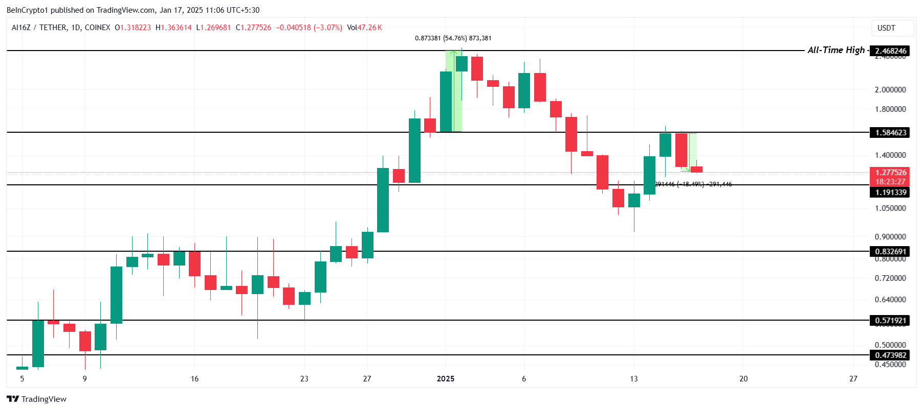 واجهت العملة البديلة رفضًا عند مستوى المقاومة $1,58، مما أدى إلى انخفاض بنسبة 18%49 خلال الـ24 ساعة الماضية. إذا استمر هذا الاتجاه الهبوطي، فإن AI16Z تخاطر بالهبوط دون مستوى الدعم الحاسم $1,19، مما قد يؤدي إلى انهيار أعمق نحو $0,08، مما يثير القلق بين المستثمرين.