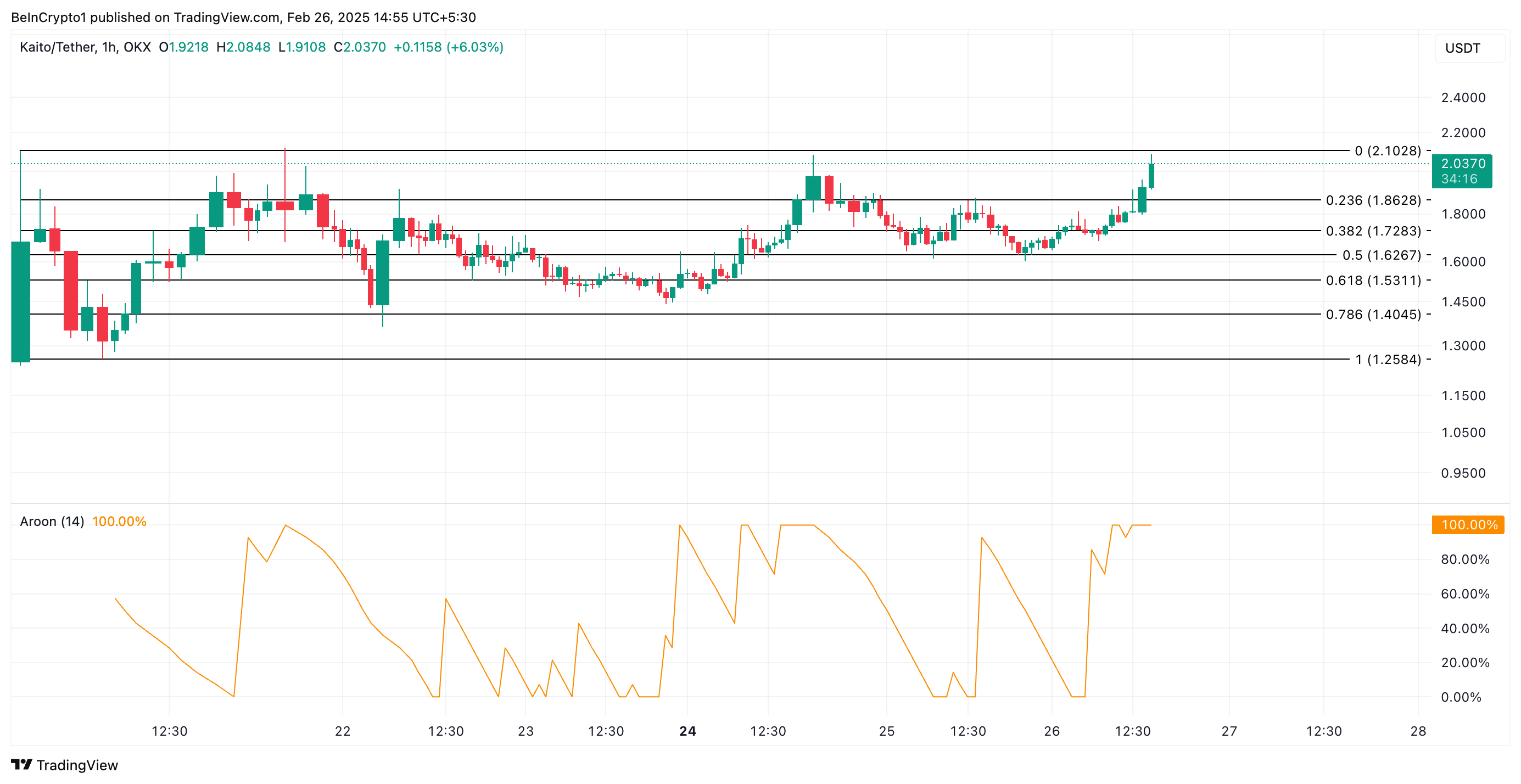 يقيس مؤشر Aroon قوة اتجاه الأصل ويحدد نقاط الانعكاس المحتملة. عندما يكون خط Aroon Up عند 100%، فإنه يشير إلى أن الأصل قد حقق مؤخرًا ارتفاعًا جديدًا ويقترح اتجاهًا صعوديًا قويًا بزخم صعودي. إذا حافظ كايتو على ارتفاعه، فقد يعيد زيارة أعلى مستوى له على الإطلاق عند $2,10.