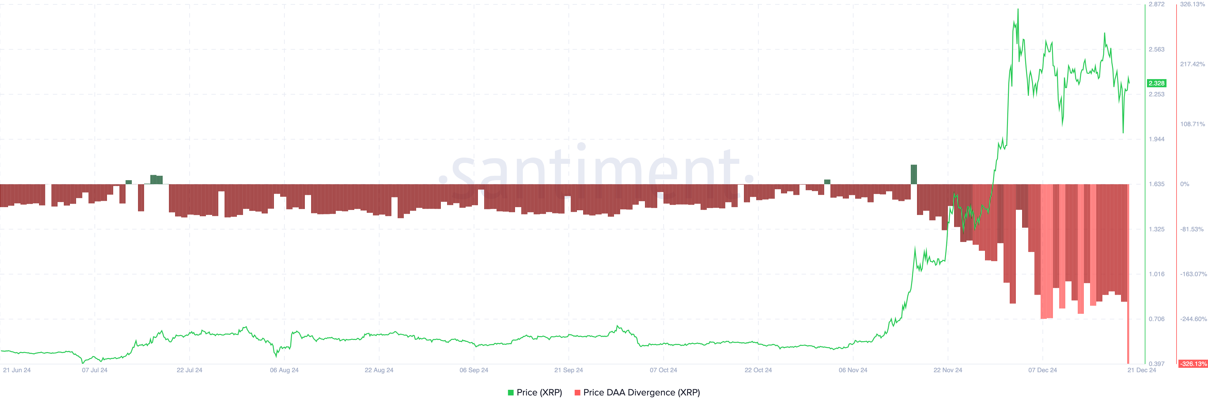 ومع ذلك، اعتبارًا من كتابة هذا التقرير، انخفض سعر تباين DAA بنسبة 326,13%، مما يشير إلى أن عدد محافظ إكس آر بي التي تتفاعل مع الرمز قد انخفض. إذا استمر هذا الاتجاه، فقد ينخفض سعر إكس آر بي إلى أقل من 2$.