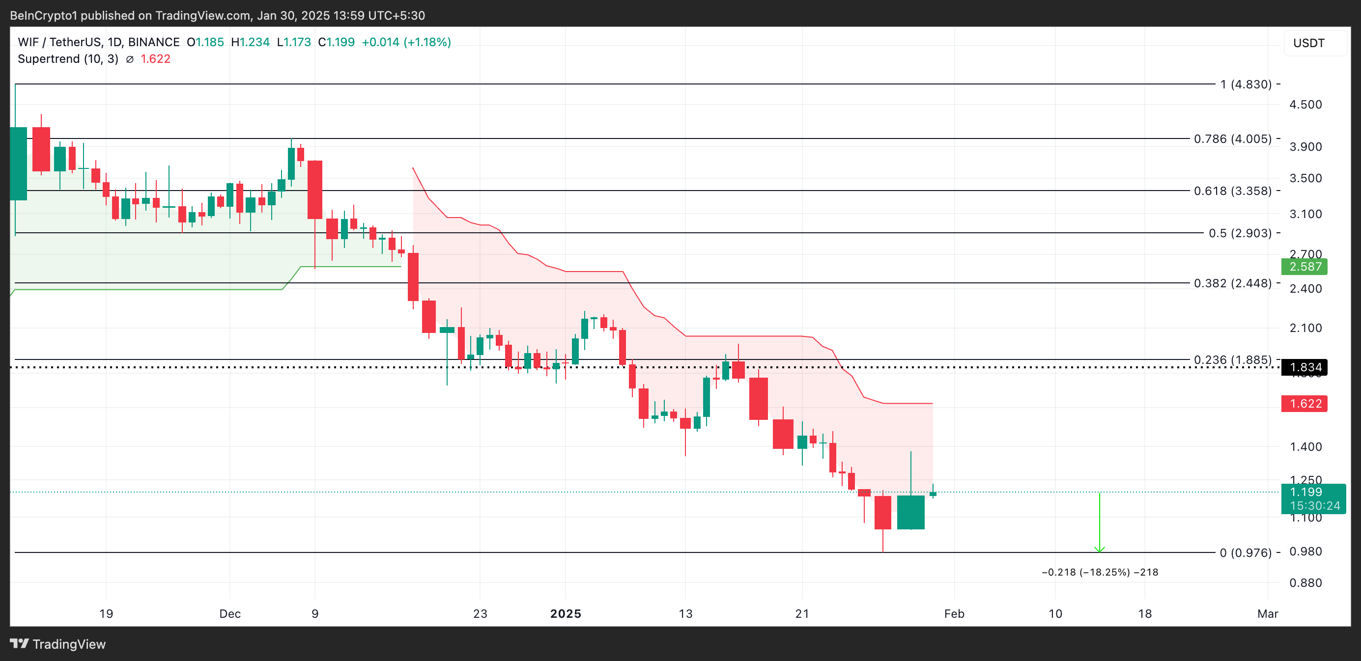 إذا استمرت عمليات البيع في السيطرة على السوق، قد يمتد سعر WIF في الانخفاض ويهبط إلى ما دون 1$ ليتداول عند 0,97$. هذا يعني انخفاضًا بنسبة 18% من قيمته الحالية.