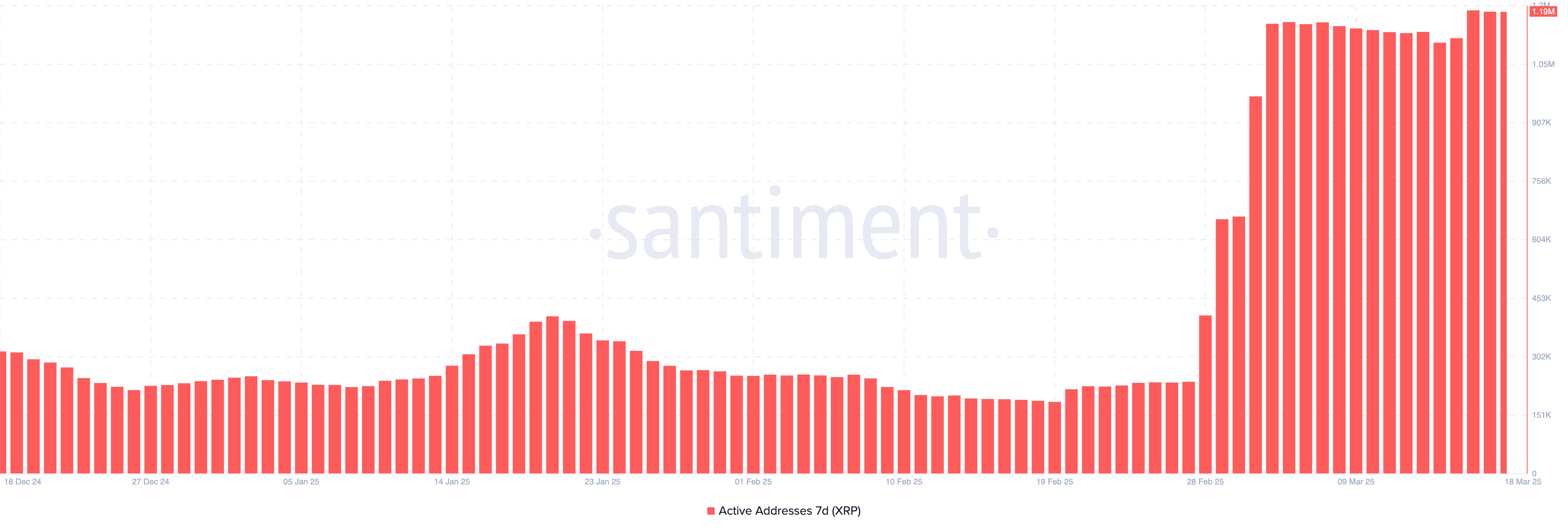 نشاط شبكة إكس آر بي يشهد ارتفاعًا، حيث وصل عدد العناوين النشطة لمدة 7 أيام إلى أعلى مستوى له على الإطلاق عند 1,19 مليون. هذا زيادة هائلة من 237 000 المسجلة في 27 فبراير، مما يمثل ارتفاعًا يقارب خمسة أضعاف في غضون أسابيع قليلة.