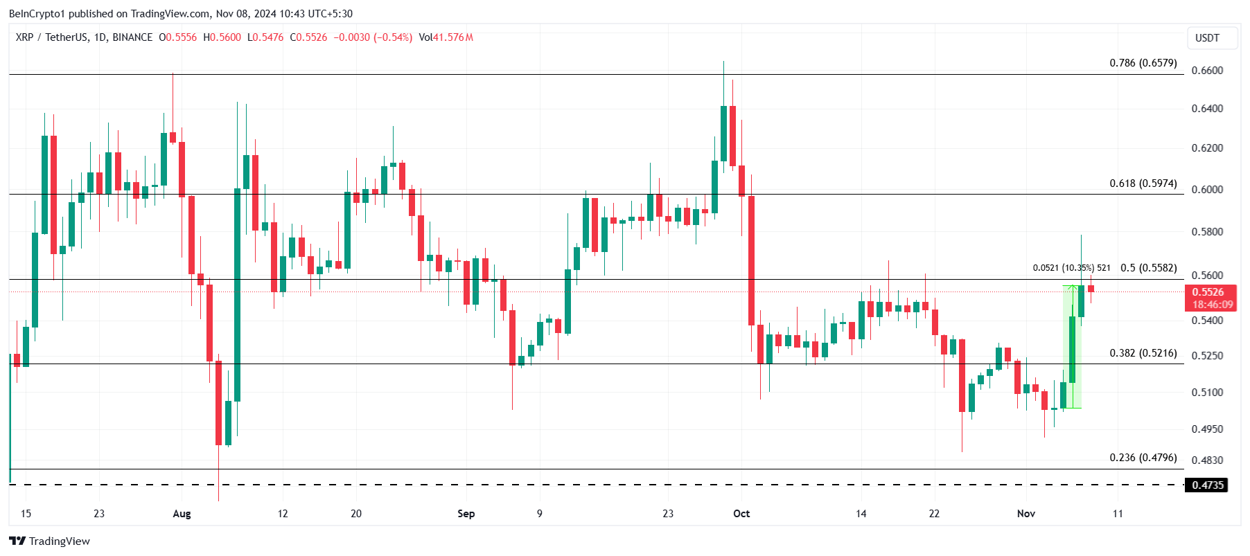 في آخر 24 ساعة، ارتفعت XRP بنسبة 10%، وتحوم قليلاً دون خط استرجاع فيبوناتشي 50% عند 0,55$. يعمل هذا المستوى كنقطة مقاومة رئيسية لـ XRP، واختراقها سيمثل أعلى مستوى شهري. العبور الناجح لهذا الخط سيشير إلى قوة متجددة، مما يجذب مشترين إضافيين.