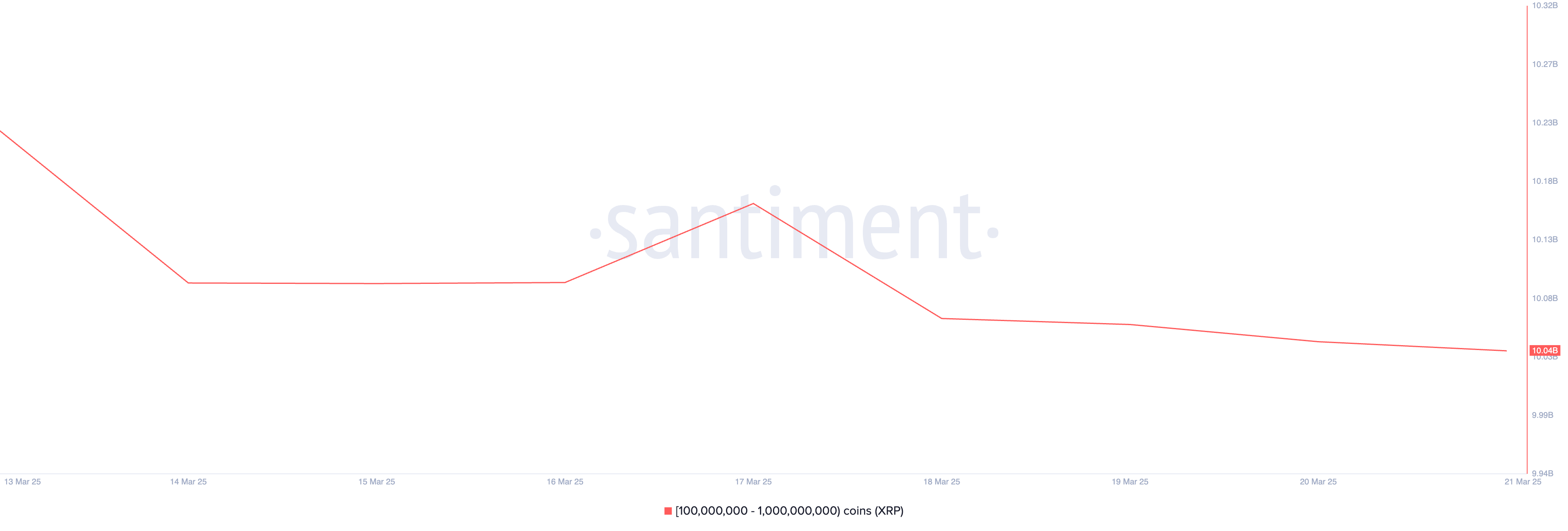 وفقًا لـSantiment، قامت الحيتان الكبيرة التي تحتفظ بين 100 مليون و1 مليار XRP ببيع إجمالي 20 مليون XRP، بقيمة حوالي 50 مليون دولار، منذ 19 مارس.