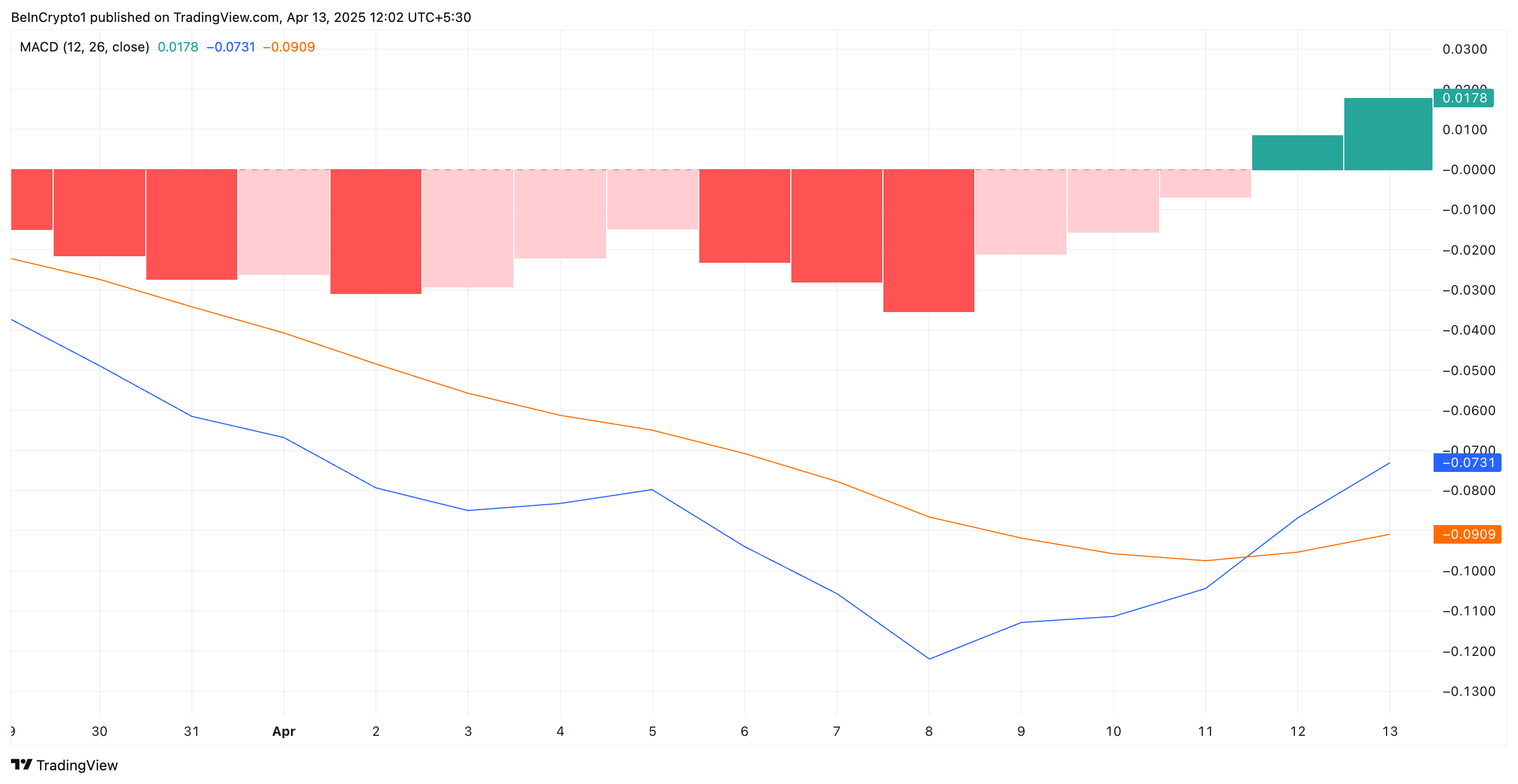 يقيس مؤشر MACD اتجاهات الأسعار والزخم للأصل، ويحدد نقاط الانعكاس. يتشكل تقاطع ذهبي عندما يعبر خط MACD (الأزرق) فوق خط الإشارة (البرتقالي).