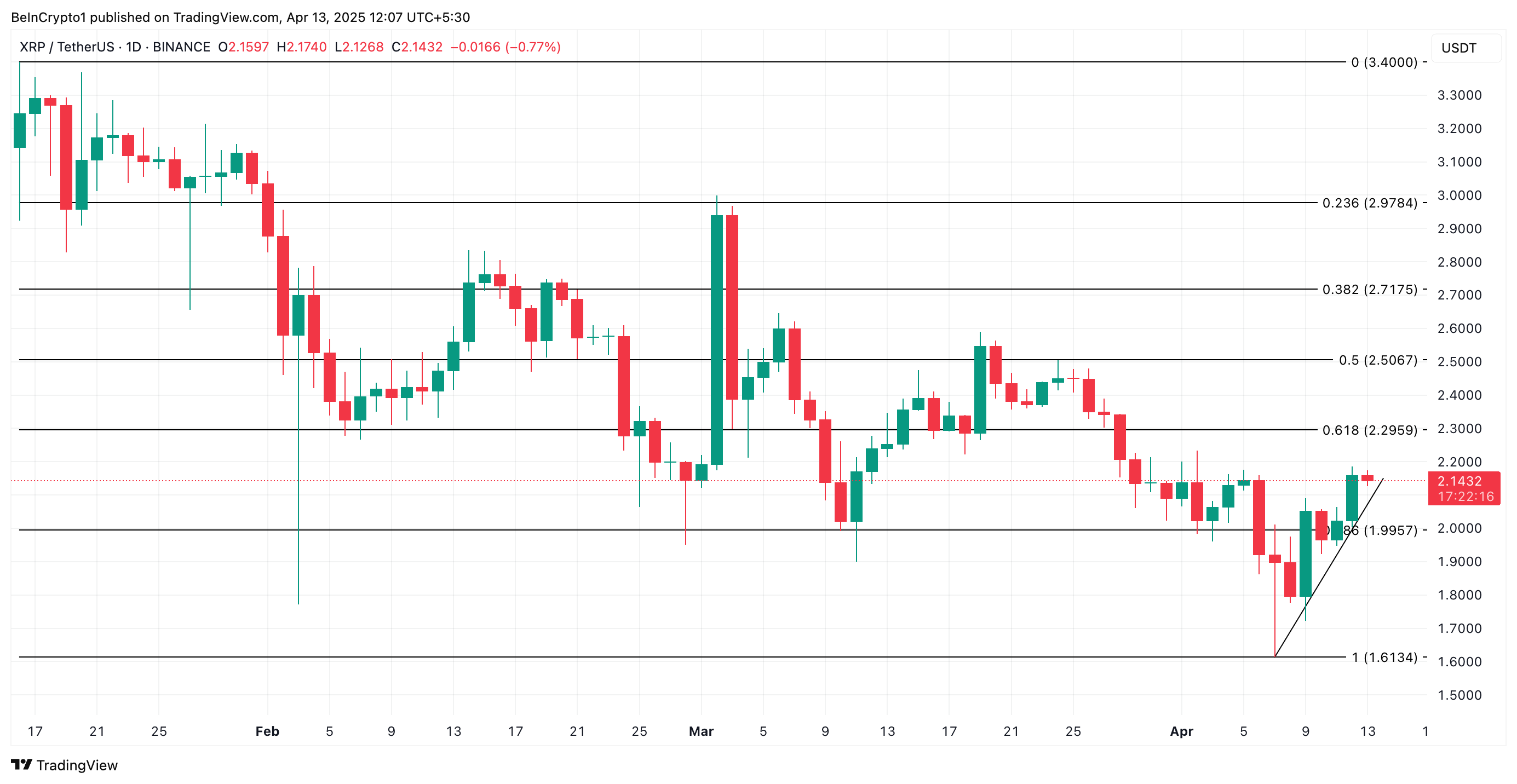 منذ أن بدأ ارتفاعها في 7 أبريل، تم تداول XRP فوق خط اتجاه صاعد. يظهر هذا النمط الصعودي عندما يشكل الأصل قيعان أعلى بمرور الوقت، مما يخلق خط دعم مائل للأعلى.