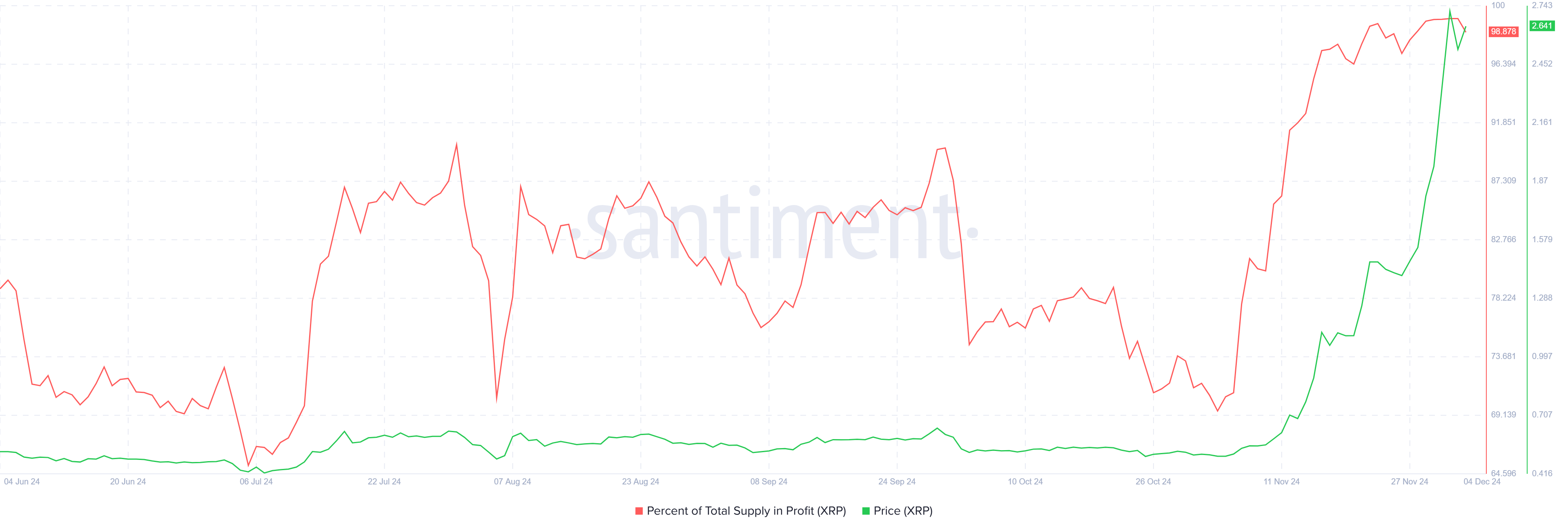 بينما يظهر الزخم الكلي لإكس آر بي إيجابيًا، إلا أنه بدأ يظهر علامات التشبع. إجمالي العرض من إكس آر بي في الربح حاليًا يزيد عن ٩٨٪، مما يشير تقليديًا إلى أن السوق يقترب من قمته.