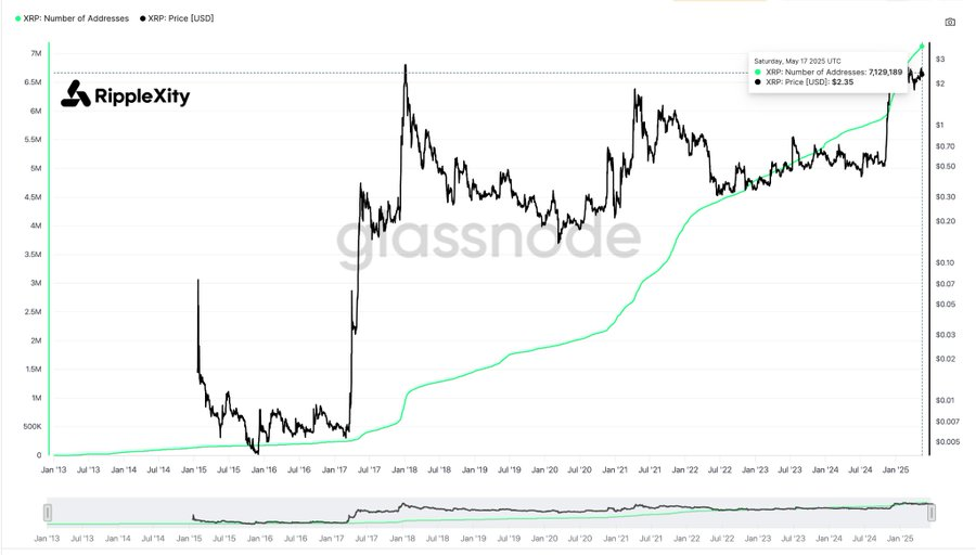 ذكرت ريبل إكسيتي، مستشهدة ببيانات Glassnode، أن تسجيلات محافظ XRP قد تجاوزت 7,1 مليون، بينما وصل عدد المحافظ التي تحتوي على أكثر من مليون XRP إلى مستوى جديد فوق 2,700.