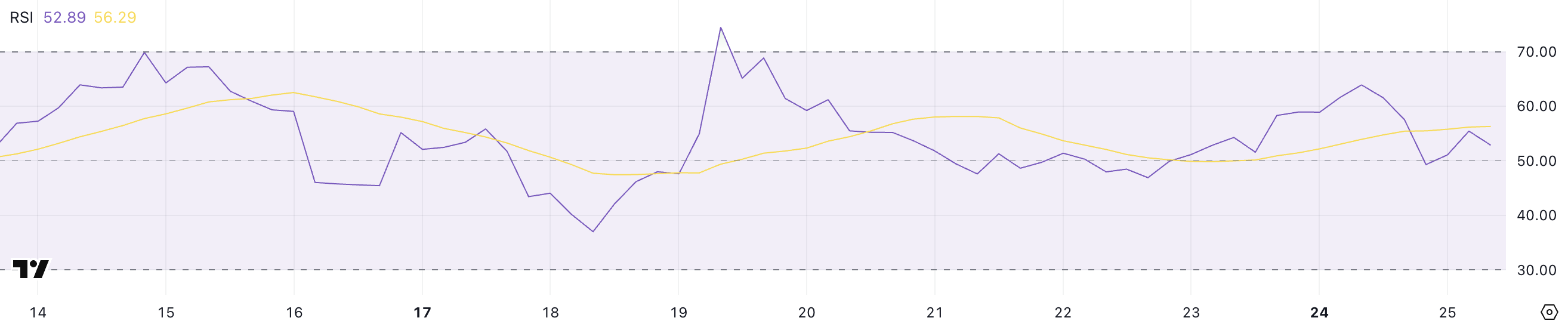 مع وجود XRP الآن عند 52,89، فإنه لا يزال فوق نقطة المنتصف ولكنه يقترب من الحياد، مما يشير إلى أن المرحلة الصعودية الأخيرة قد تكون في طريقها للتهدئة ما لم تتدخل نشاطات شراء جديدة.
