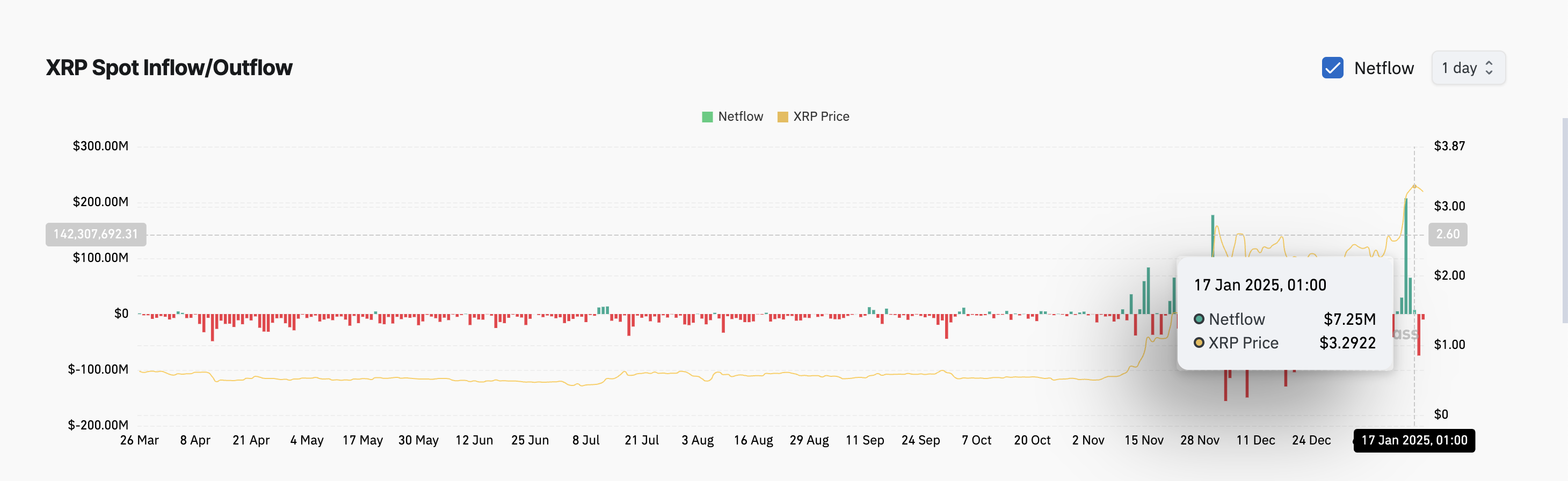 شهدت ريبل إكس آر بي ارتفاعًا ملحوظًا مؤخرًا، حيث وصلت إلى أعلى مستوى لها على الإطلاق عند ٣,٤١ دولار في ١٦ يناير. ومع ذلك، أثار هذا الارتفاع موجة من جني الأرباح بين المتداولين، مما يهدد الآن استدامة مكاسبها الأخيرة.