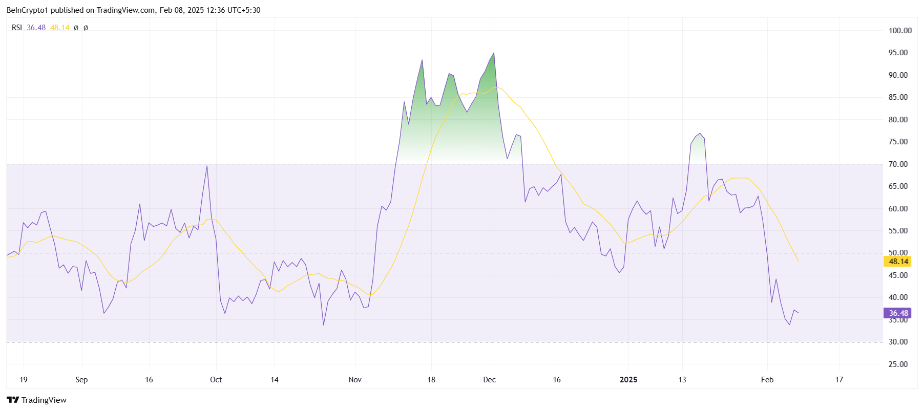 انخفض مؤشر القوة النسبية (RSI) لإكس آر بي إلى أدنى مستوى له في ثلاثة أشهر، مما يعزز الزخم الهبوطي القوي. يشير مؤشر القوة النسبية، الذي يقيس قوة السوق، إلى أن ضغوط البيع تتزايد.