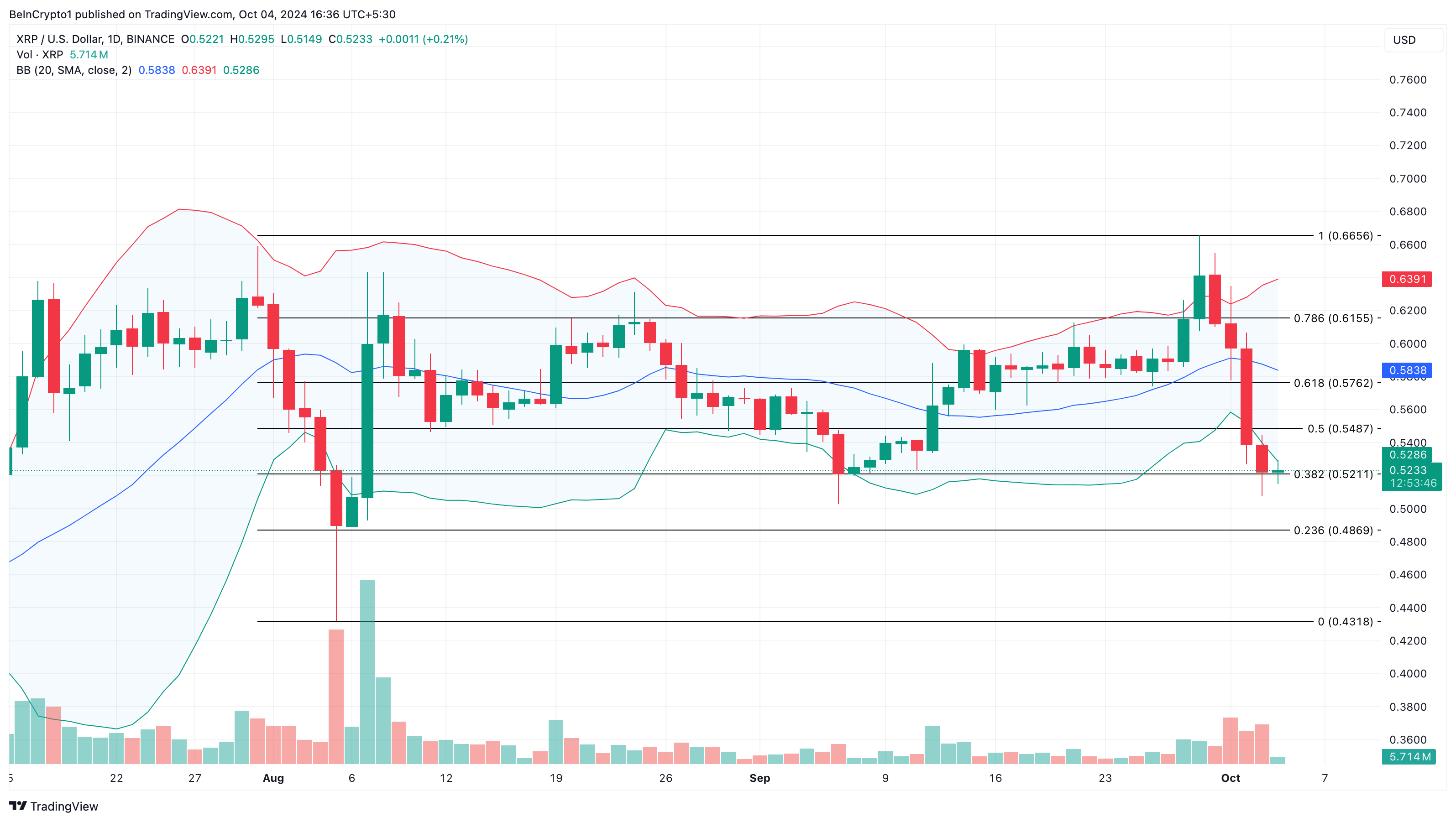 هذا يشير إلى أن ضغط الشراء الطفيف قد يكون كبيرًا في تحفيز الارتداد. بالإضافة إلى ذلك، فإن سعر العملة البديلة في نفس الموقع كمستوى ارتداد فيبوناتشي 38,2%. هذه النسبة، المعروفة أيضًا باسم أرضية الدعم، قد تكون حيوية أيضًا في مساعدة الريبل على الارتداد.