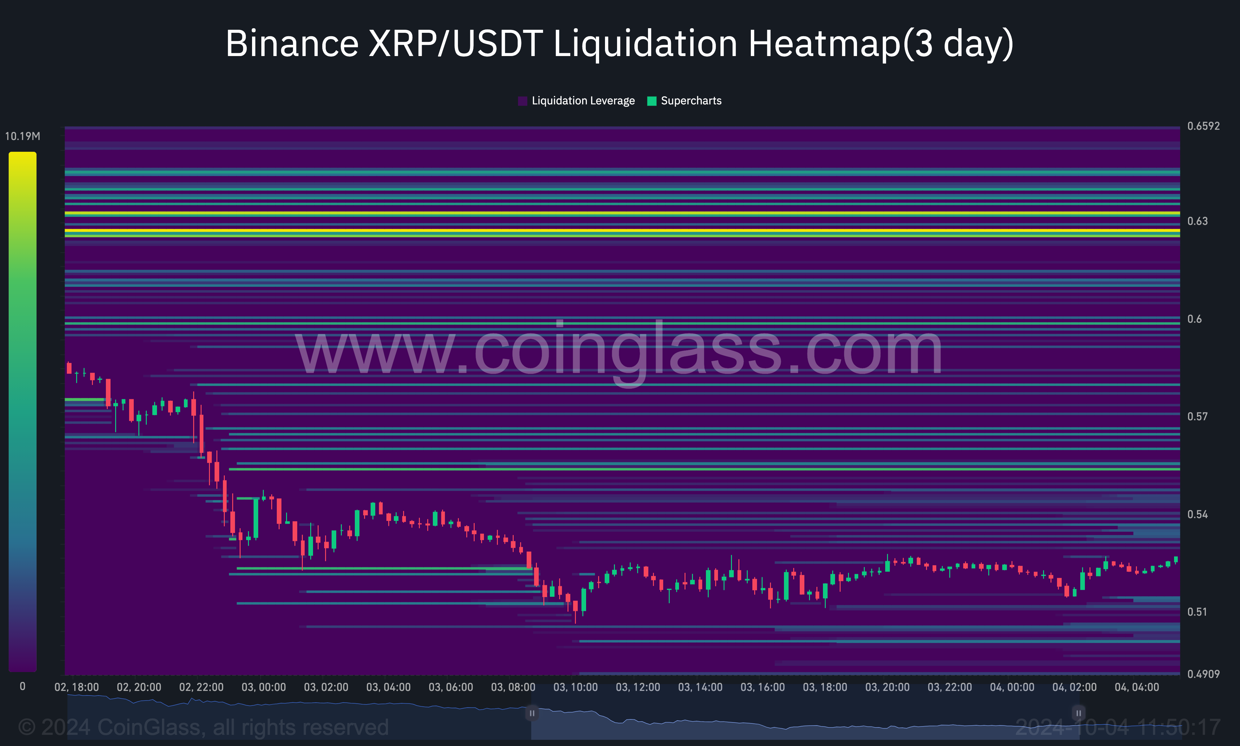 كما أنها تساعد المتداولين على إيجاد أفضل مواقع السيولة. على وجه التحديد، إذا تغير اللون من الأرجواني إلى الأصفر، فهناك تركيز عالي للسيولة في تلك النقطة، وقد يتحرك السعر في تلك الاتجاه. بالنسبة لـ XRP، تقع هذه المناطق بين 0,62$ و0,63$. وعليه، قد تشهد قيمة العملة البديلة قريبًا ارتدادًا نحو تلك المستويات.