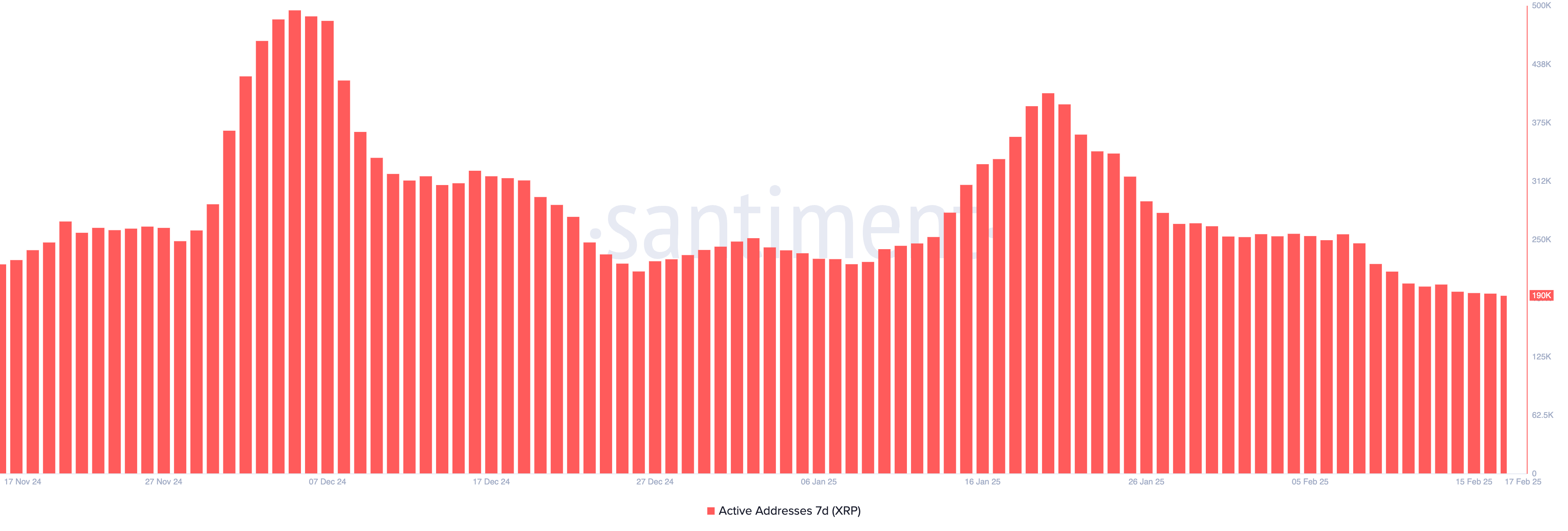 العناوين النشطة لإكس آر بي لمدة 7 أيام انخفضت إلى 190470، مما يمثل انخفاضًا حادًا بنسبة 53% من 407000 المسجلة في 20 يناير. يتتبع هذا المقياس عدد العناوين الفريدة المشاركة في المعاملات على مدى فترة سبعة أيام، ويعمل كمؤشر رئيسي لنشاط الشبكة والمشاركة العامة للمستخدمين.