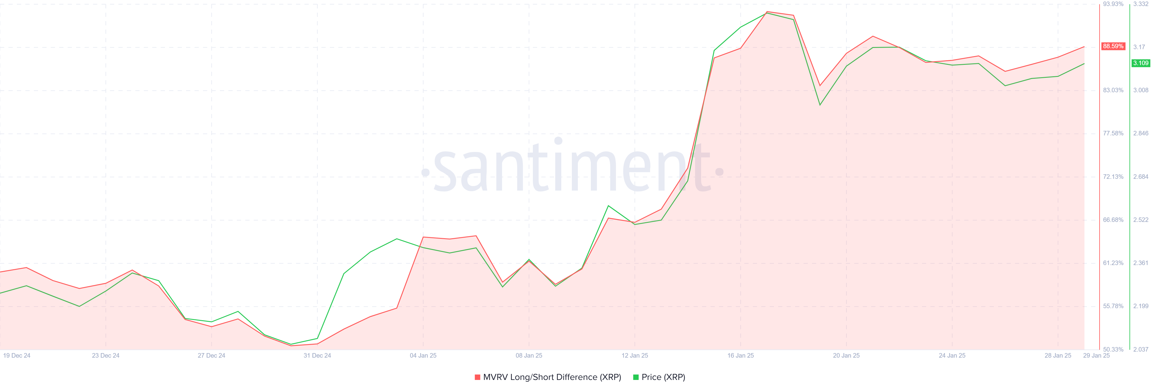 يبقى الزخم الكلي لريبل قويًا، كما هو موضح في الفرق بين MVRV طويل/قصير، والذي هو حاليًا إيجابي للغاية. يشير هذا إلى أن حاملي المدى الطويل لا يزالون في الربح، مما يعزز التزامهم بالأصل. تاريخيًا، يلعب حاملو المدى الطويل دورًا حاسمًا في الحفاظ على استقرار الأسعار، مما يقلل من احتمالية البيع الحاد.